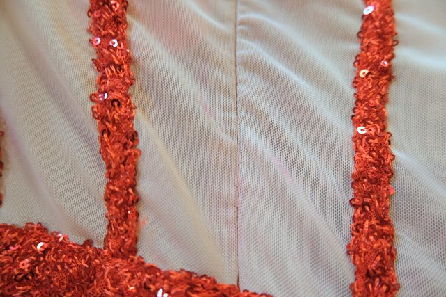 透け感があるベージュ生地にキラキラ輝くスパンコールやボリューミーなフェザースカートが魅力的なヨーロピアンパーティードレス