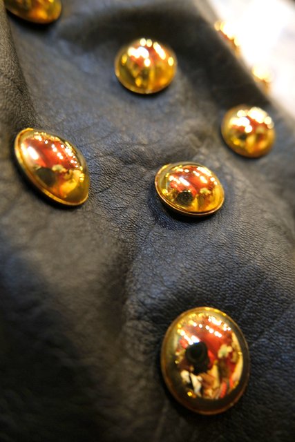 丸い大きなゴールドスタッズやドレープ感があるアシンメトリーデザインが魅力的なヨーロピアンレザースカート(ホックを紐に変えればフリーサイズ)
