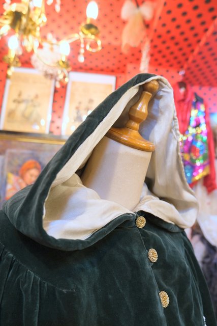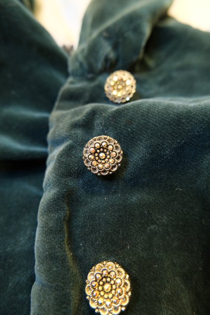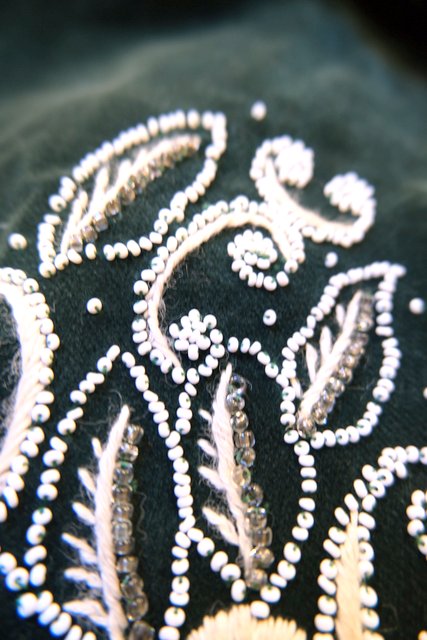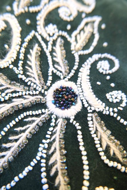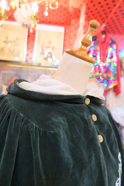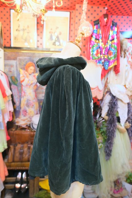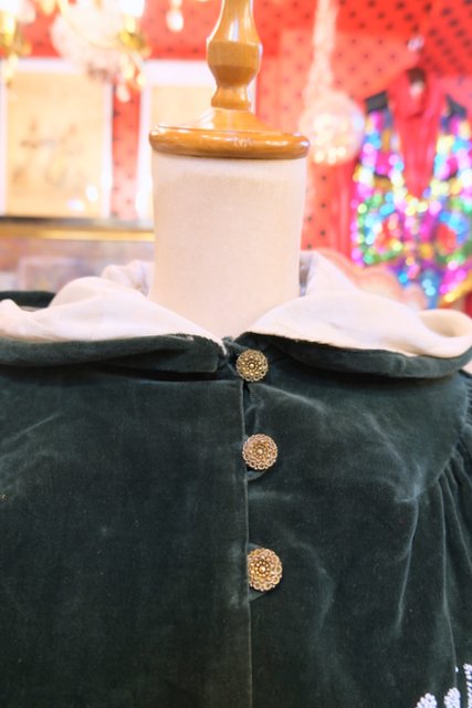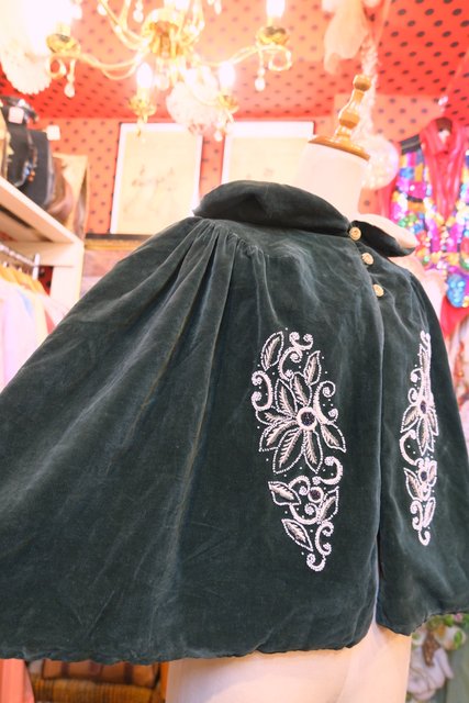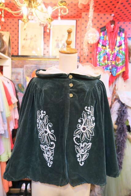 艶があり高級感漂う深緑色のベロア生地に花柄のビーズ刺繍装飾が魅力的な1940年代頃のヨーロピアンアンティークケープ