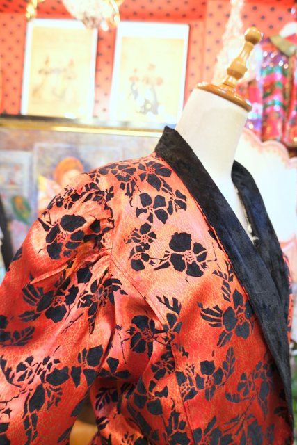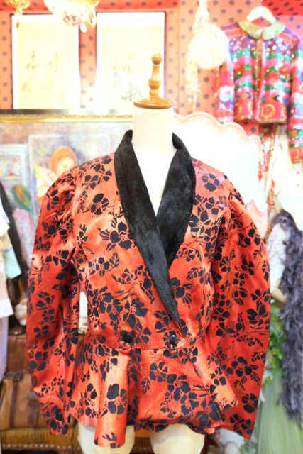 光沢がある赤×爬虫類模様の生地に黒ベロアの花柄フロッキー加工やペプラムデザインがエレガントな1980年代頃のフランス製ヴィンテージシャツジャケット