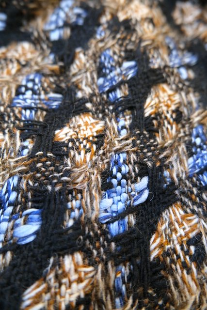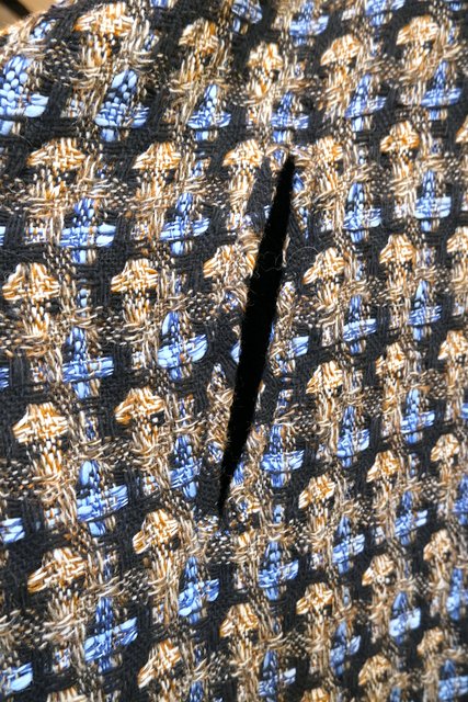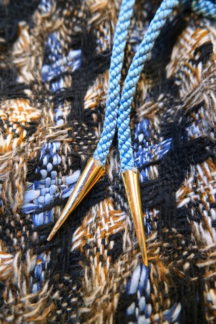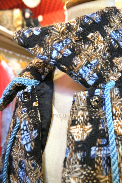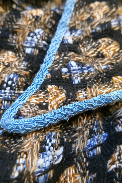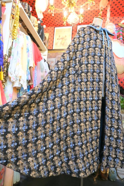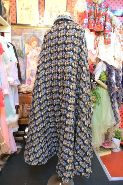 クラシックな雰囲気の黒×水色×茶色のツイード生地にブレードテープやリボンがお洒落な1970年代頃のヨーロピアンヴィンテージロングマント