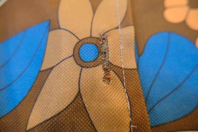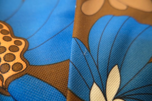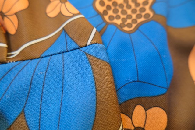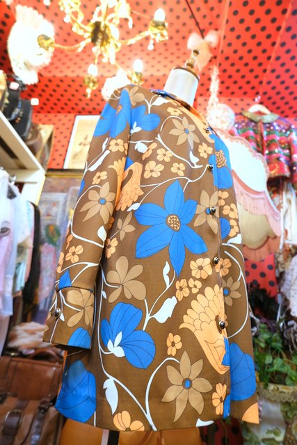 茶系ベースにオレンジ×ブルーのお花プリントがレトロ感たっぷりの1970年代ヨーロピアンヴィンテージシャツ