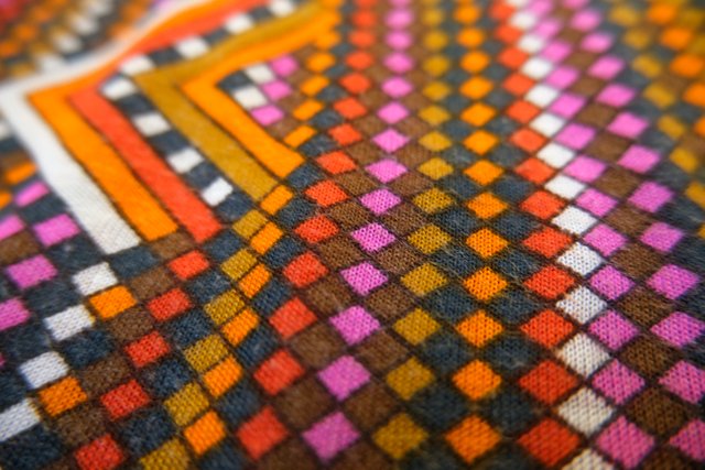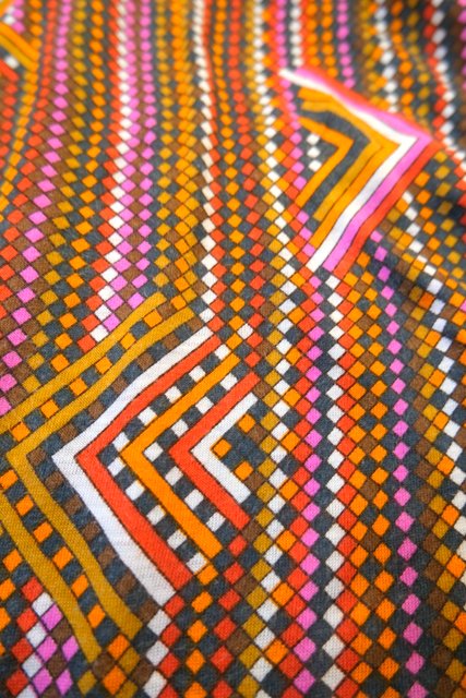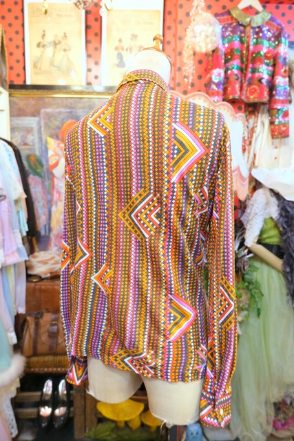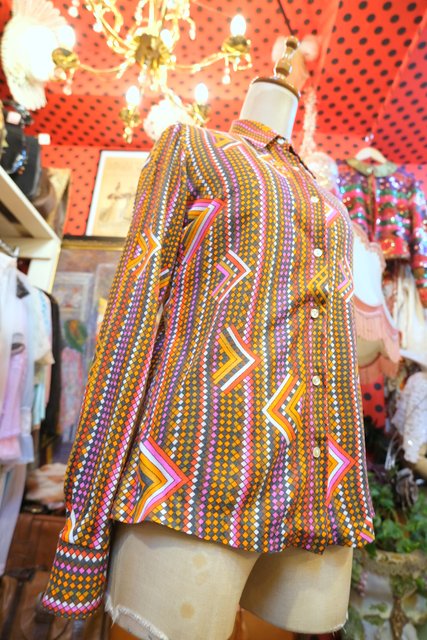 ピンク、オリーブグリーン、オレンジ系のレトロなジオメトリック柄に小さな襟が可愛らしい1960~70年代頃のフランス製ヴィンテージブラウス