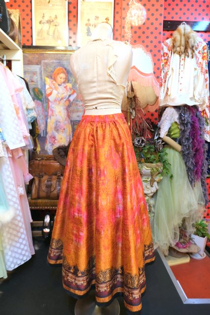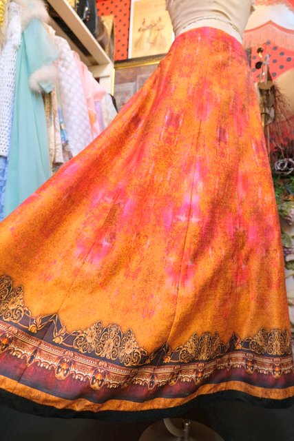 目を惹くピンク、オレンジ、茶系のMIXカラーに裾のエレガントなプリントが魅力的なヨーロピアンエスニックロングスカート ★SALE★