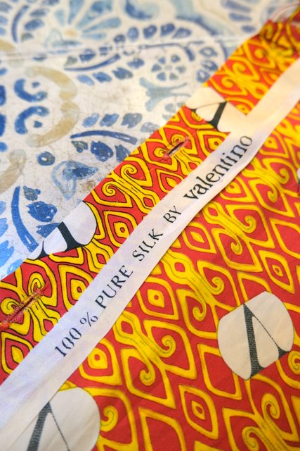 カラフルでジオメトリックな総柄×Vロゴに肌触りの良いシルク生地が魅力的な1980~90年代頃のVALENTINOヴィンテージシャツ