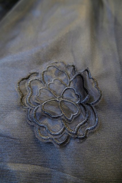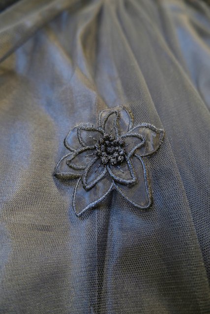 甘めなファッションにもカジュアルなファッションにも合わせやすいヨーロピアン黒チュールスカート 左前のお花ワッペンがお洒落ポイント!