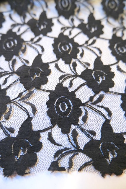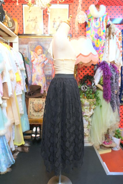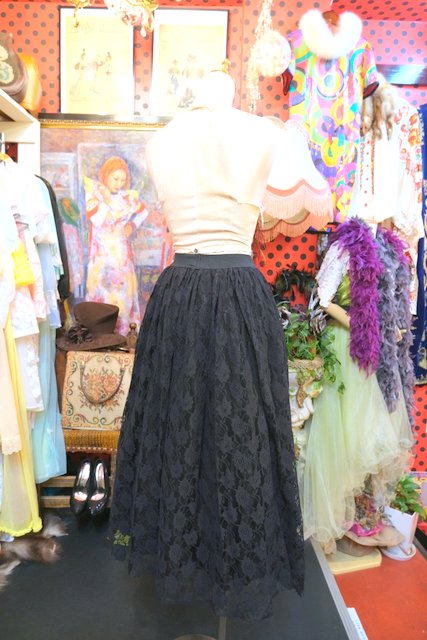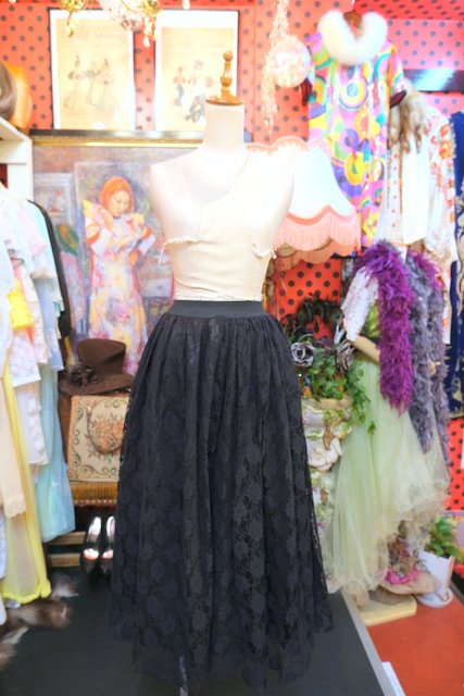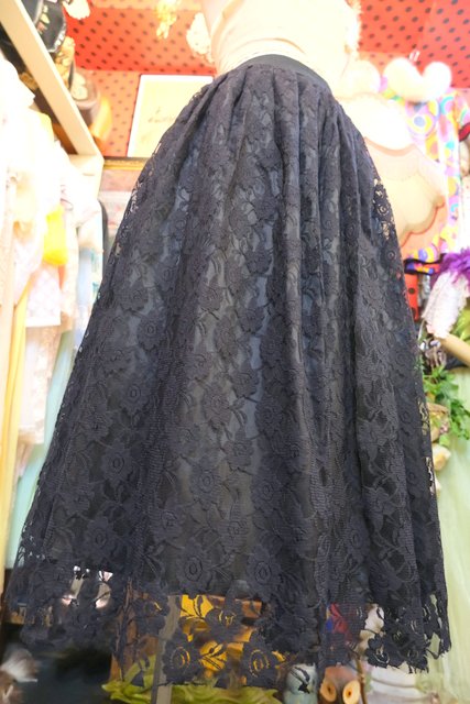 モードな黒花柄レース×ふんわり広がるウエストギャザー入りデザインがカッコ可愛い1980年代頃のフランス製ヴィンテージレーススカート