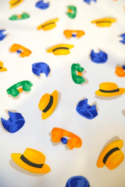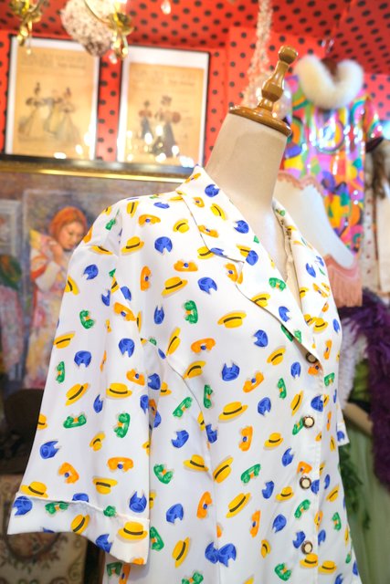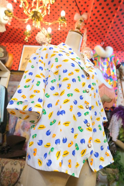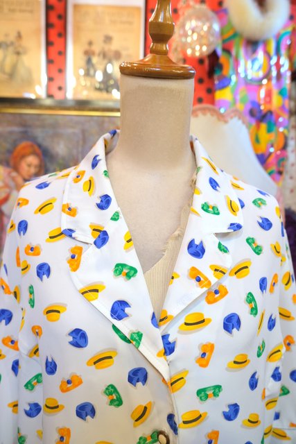 ポップな帽子やヘアバンド柄にレトロボタンが可愛らしい1980年代頃のフランス製ヴィンテージ半袖シャツジャケット