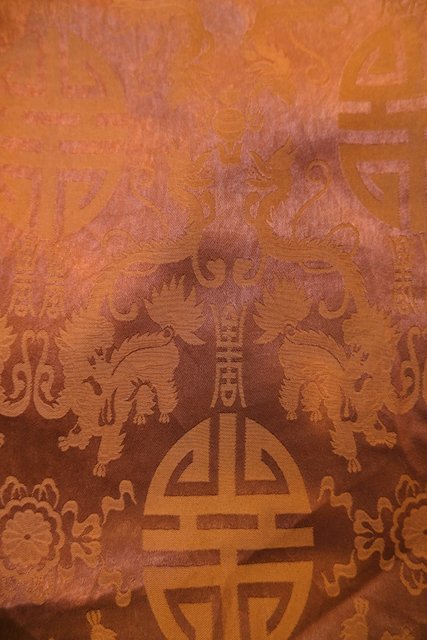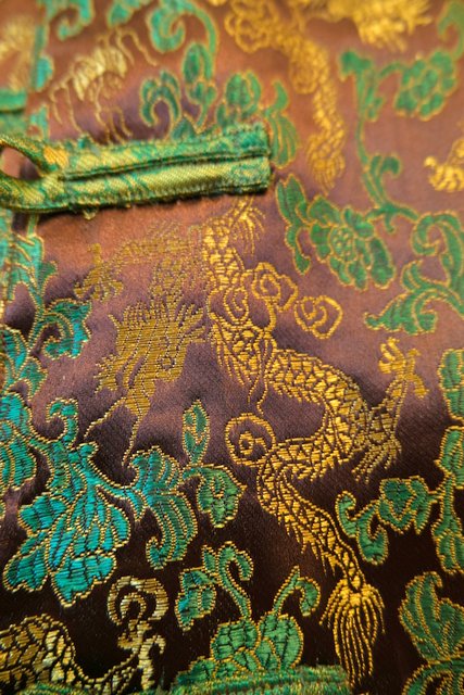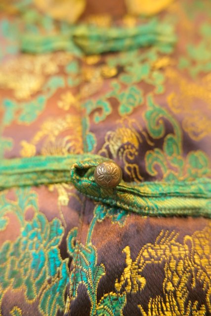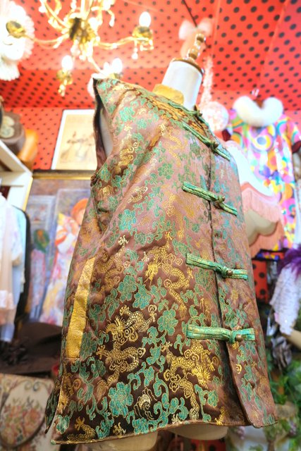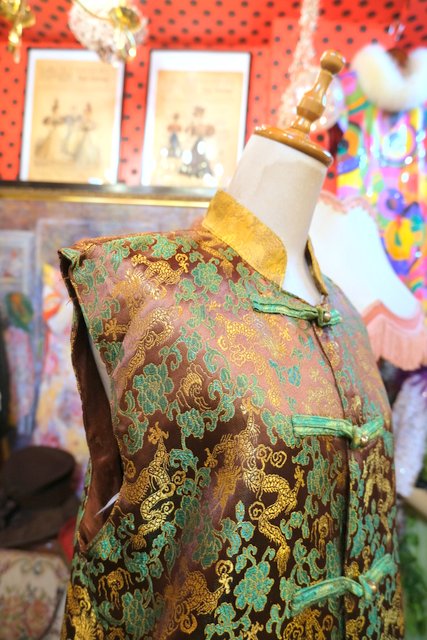 光沢があるこげ茶色×龍デザインにバックの阿弥陀如来パッチワークやハスのボタンが魅力的なヨーロピアンヴィンテージチャイナベスト 和モダンな裏地もお洒落ポイント!