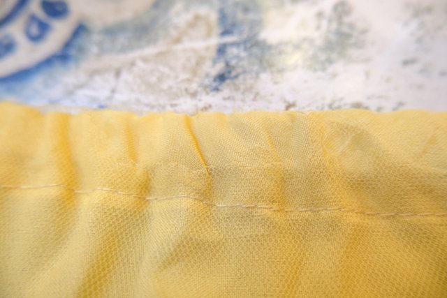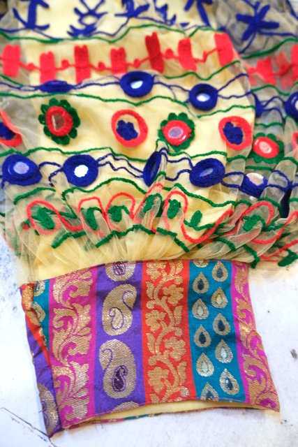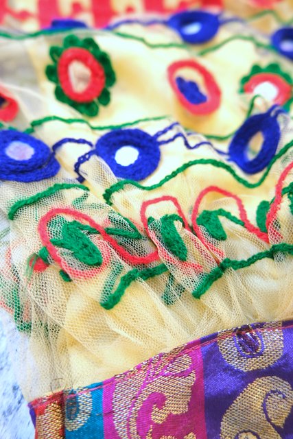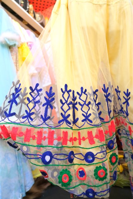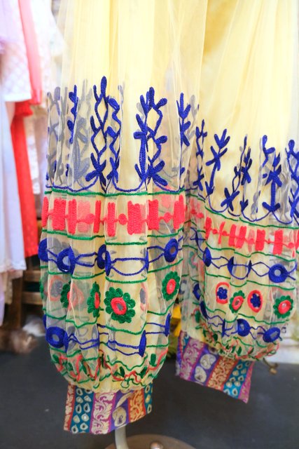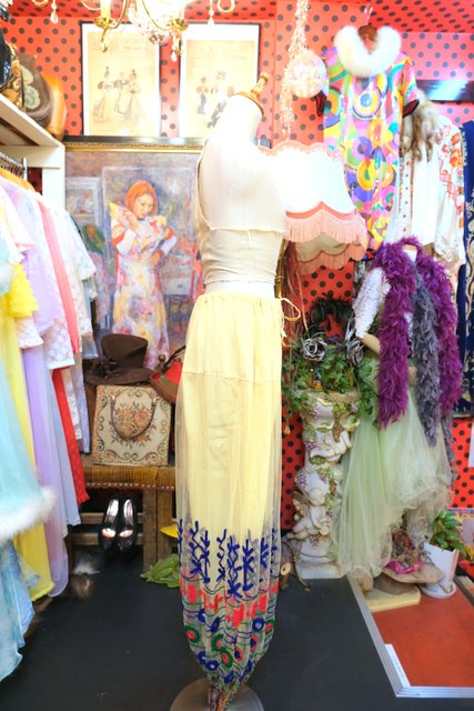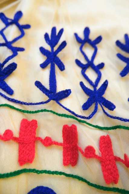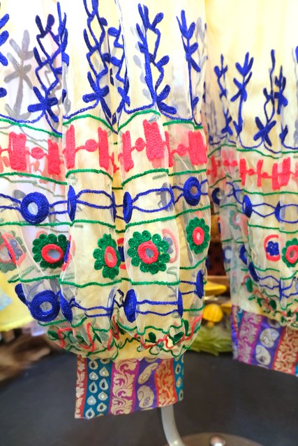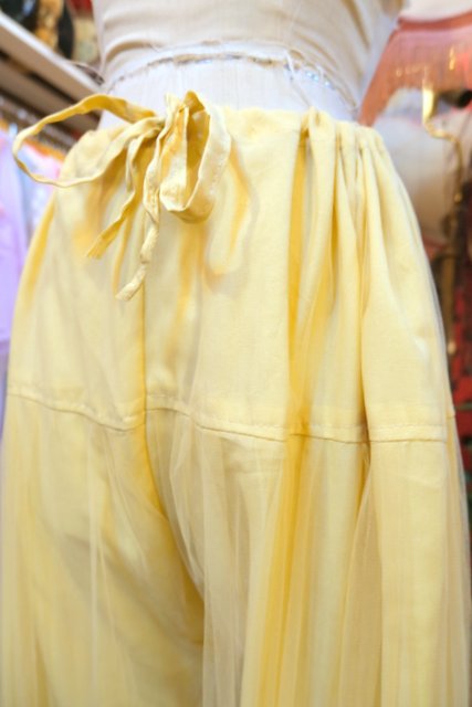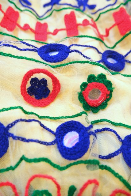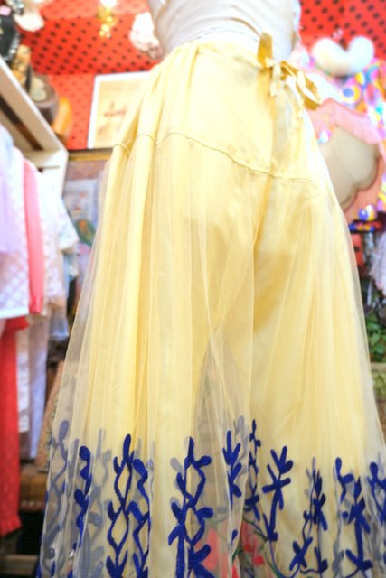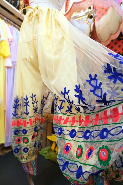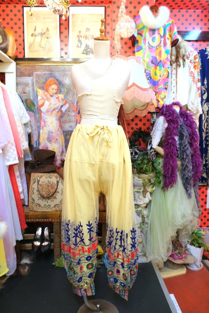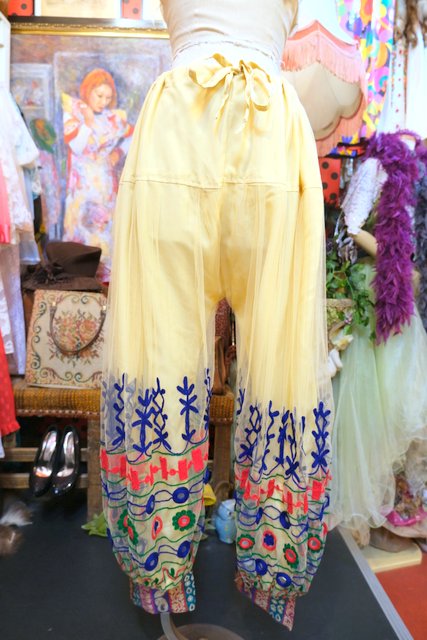 透け感があるボリューミーなベージュシフォンにカラフルな毛糸刺繍が魅力的なヨーロピアンヴィンテージエスニックパンツ