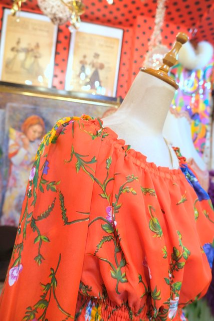 目を惹く赤ベースに華やかな花柄プリントが魅力的な1970年代頃のヨーロピアンヴィンテージワンピース