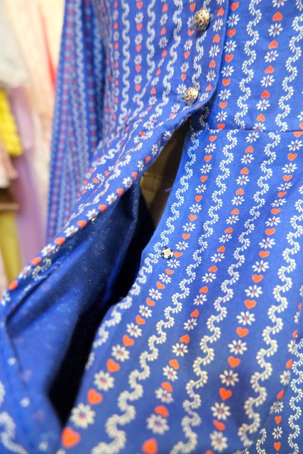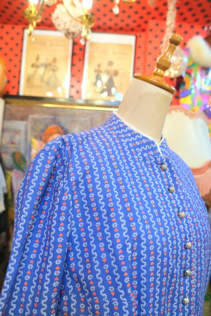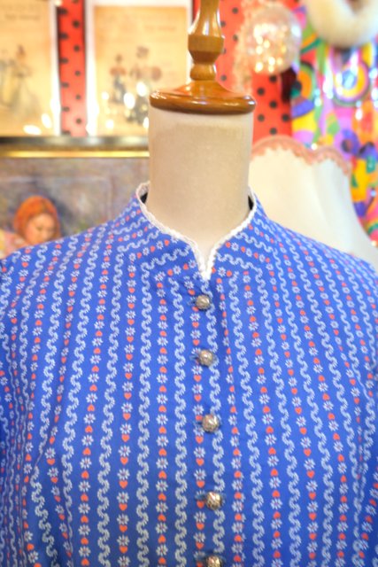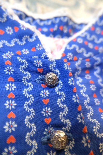 ハートやお花のカントリーな総柄に首周りのレースやアンティークボタン、エプロン付きが可愛らしい1970年代頃のヨーロピアンヴィンテージチロルワンピース 裏地もお洒落ポイント!