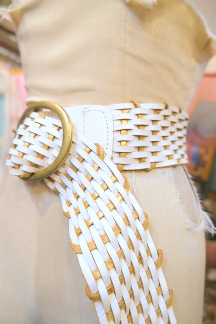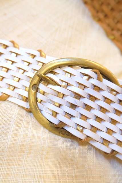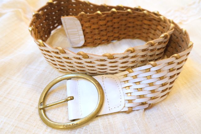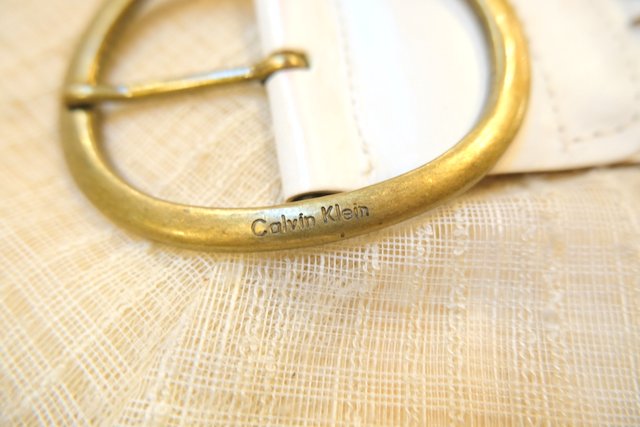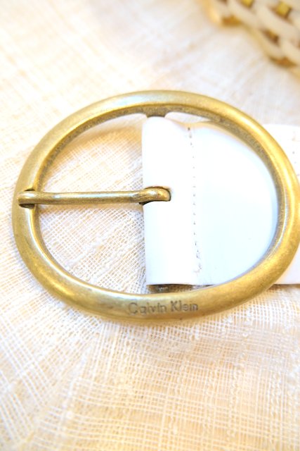 白×ゴールドの幅広い本革にウエストが自由に変えれるメッシュデザインが魅力的なカルバンクラインCalvinKleinレザーベルト