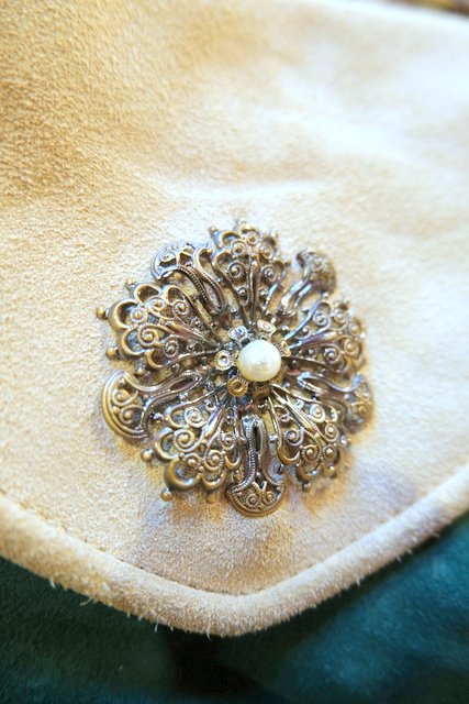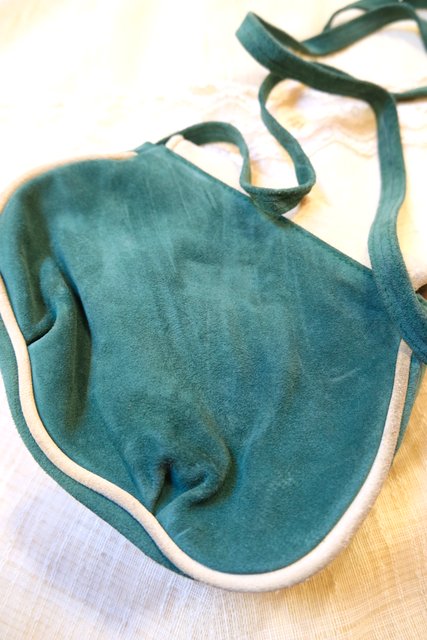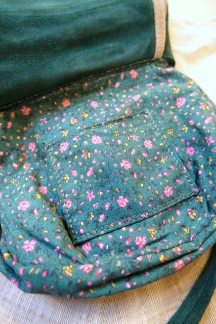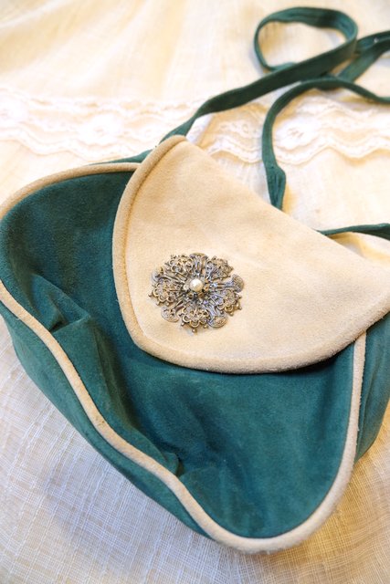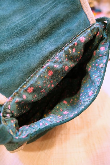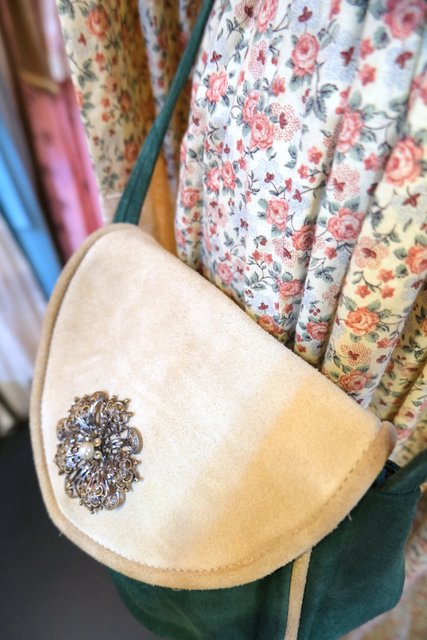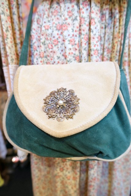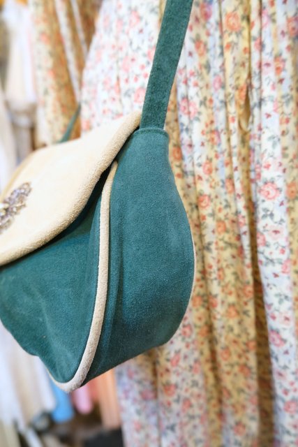 グリーン×ベージュのレトロ感たっぷりの色合いに底のギャザーデザインやアンティーク飾りが魅力的な1960~70年代頃のヨーロピアンヴィンテージショルダーバッグ 花柄裏地がお洒落ポイント!