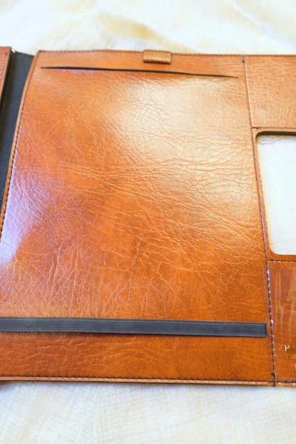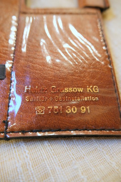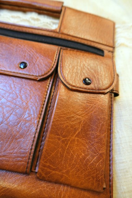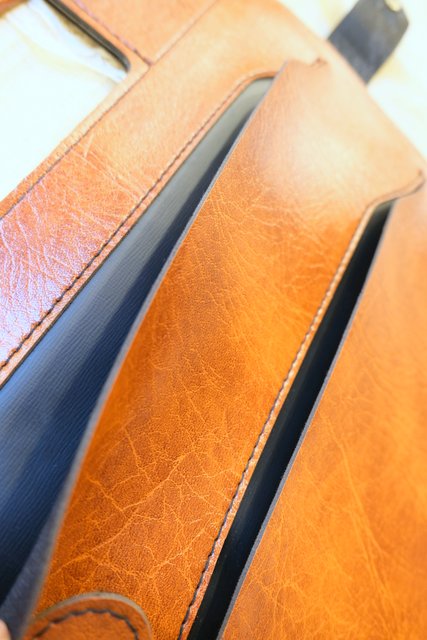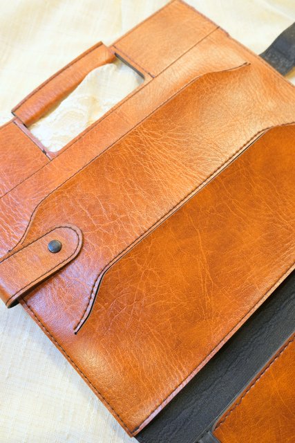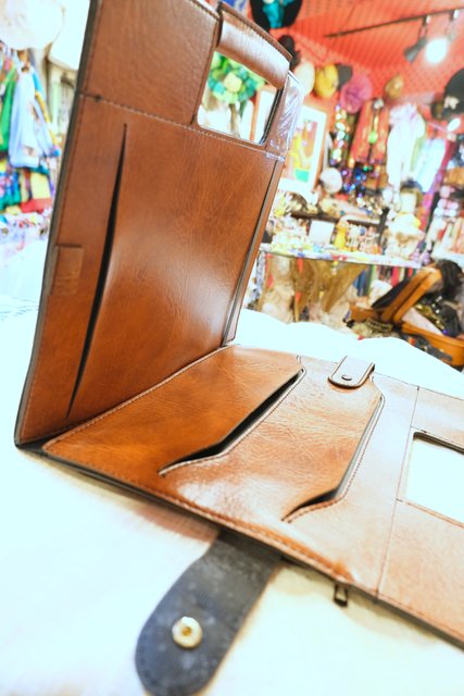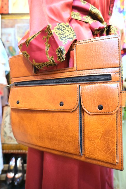 薄いフォルムが個性的!書類などを入れるポケットがいくつもデザインされたドイツの会社名入り合皮レトロバッグ