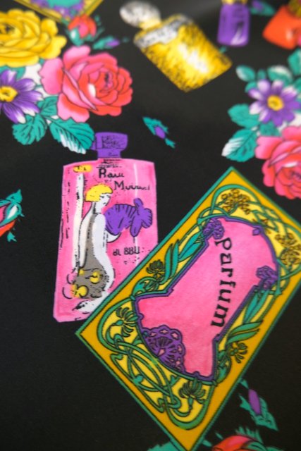 エレガントな花柄やカラフルな香水瓶プリントが魅力的な1980年代頃のヨーロピアンヴィンテージカットソー