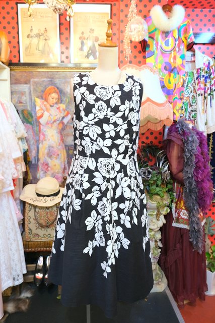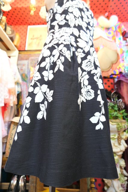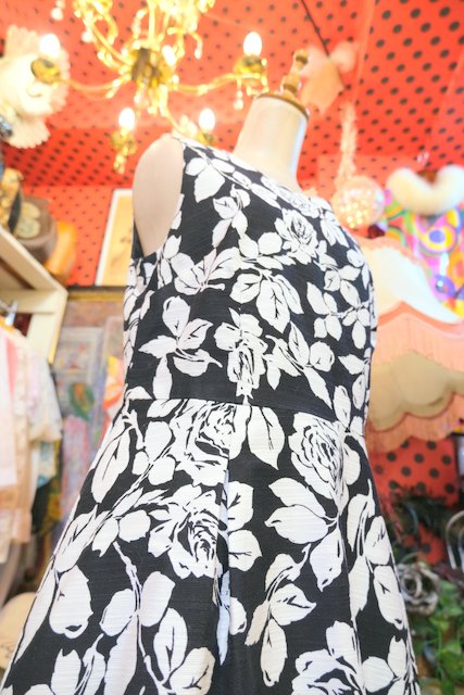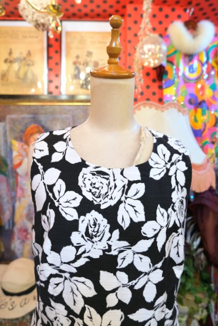 大人モードな黒ベースに白い薔薇柄がモダンでエレガントなヨーロピアンノースリーブワンピース ★SALE★