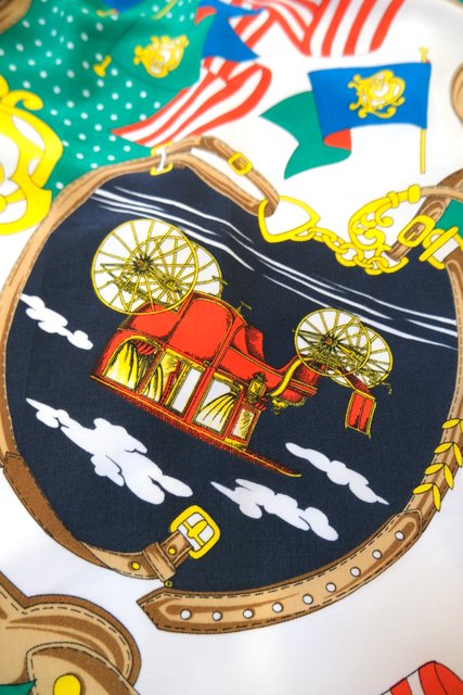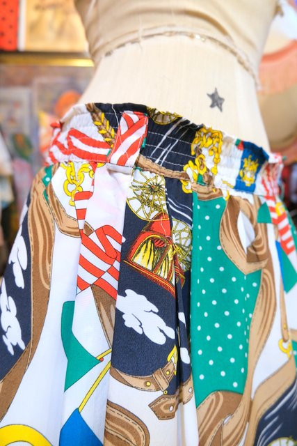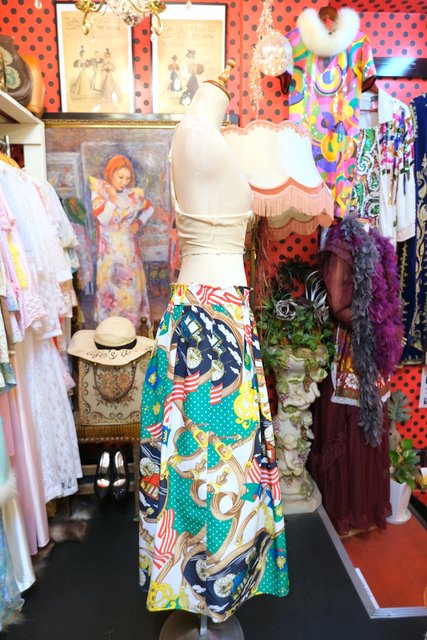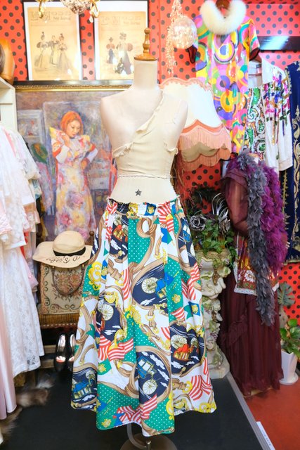 ドットや国旗、ベルトなどのカラフルポップな総柄にレトロなクラシックカーが目を惹く1980年代頃のヨーロピアンヴィンテージロングスカート