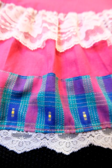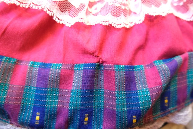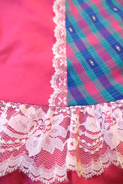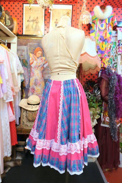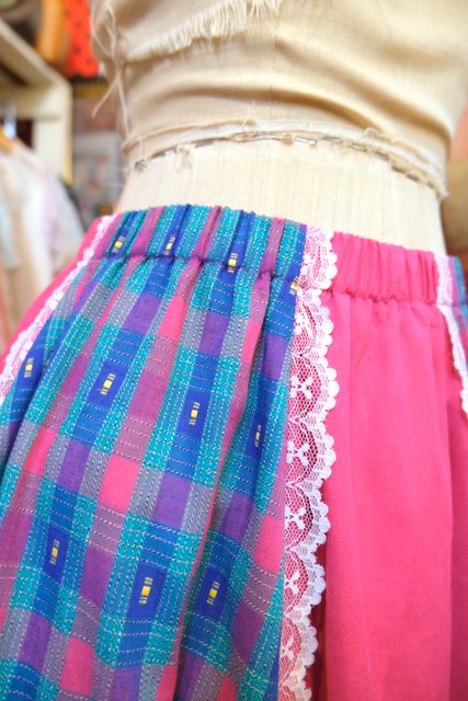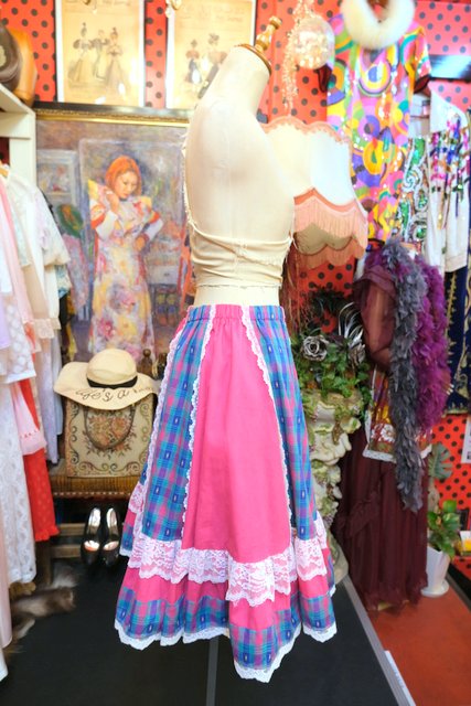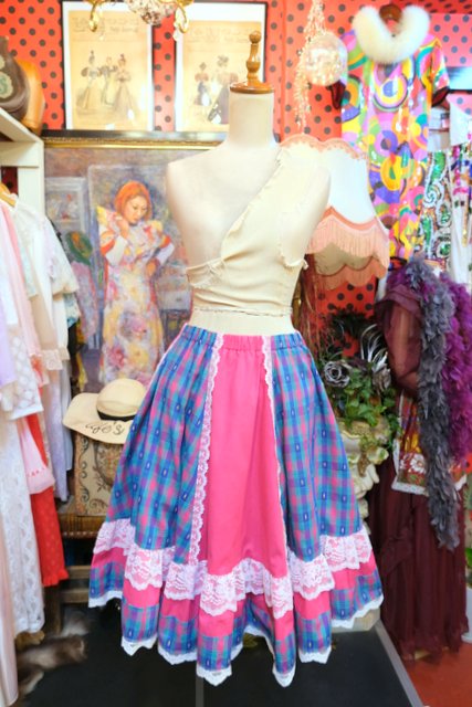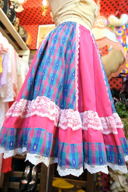 レトロなチェック×アザレ色の切り替えデザインに花柄レースが可愛らしい1980年代頃のUSA製ヴィンテージフリルスカート