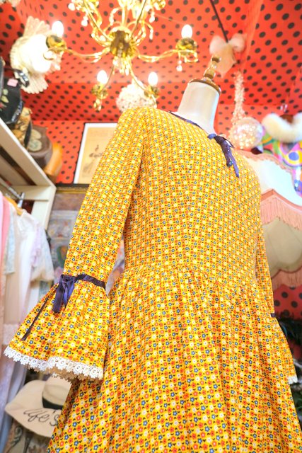 レトロポップな小花柄プリントにネイビーテープや花柄レース、エレガントなフレアカフスが魅力的な1970年代頃のヨーロピアンヴィンテージロングワンピース