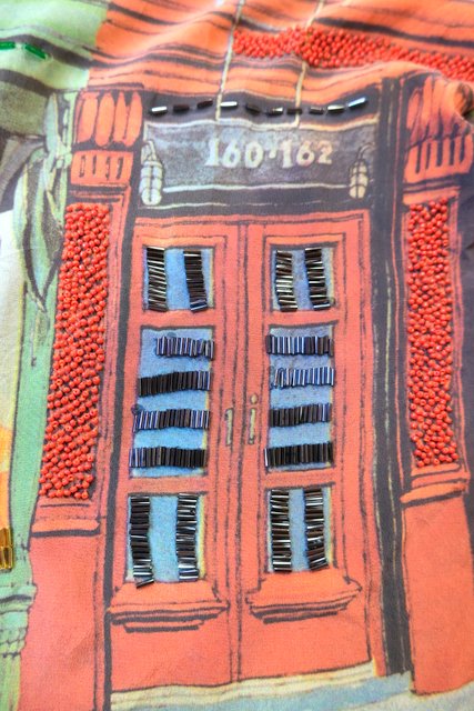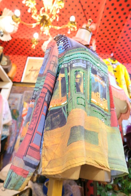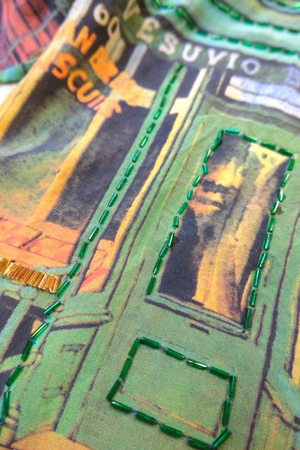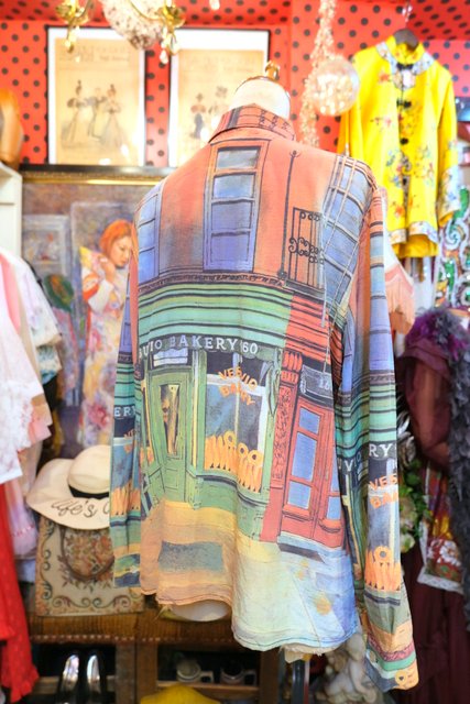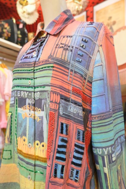 レトロ感たっぷりのパン屋さん街並みプリントにキラキラ輝くビーズデザインがお洒落な1980年代頃のヨーロピアンヴィンテージシャツ