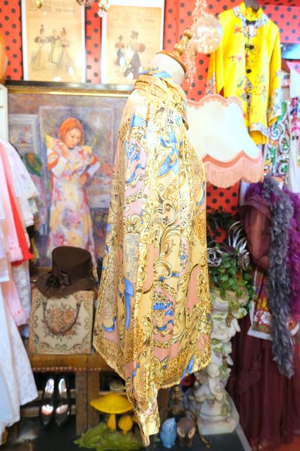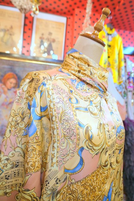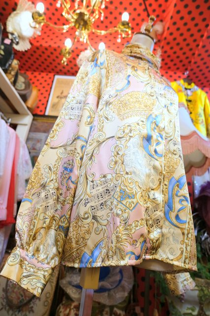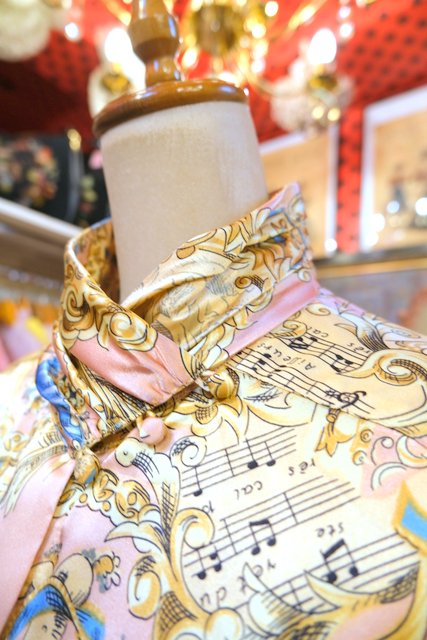 光沢感がある生地にドレープがある立ち襟や天使&楽譜プリントが可愛らしい1980年代頃のヨーロピアンブラウス