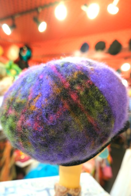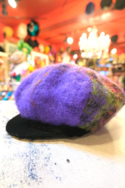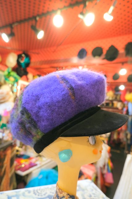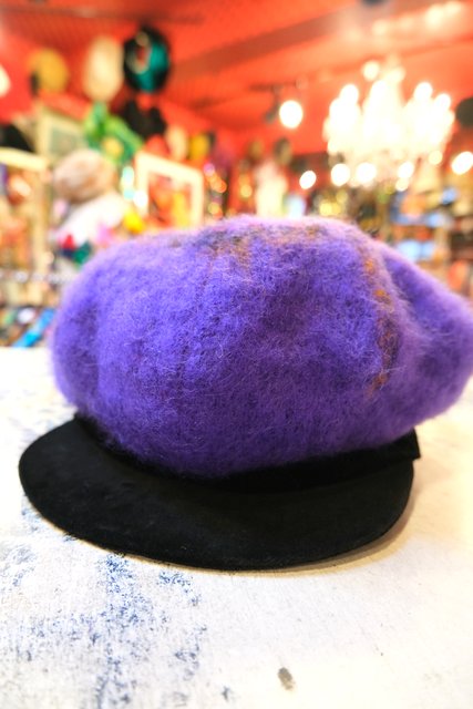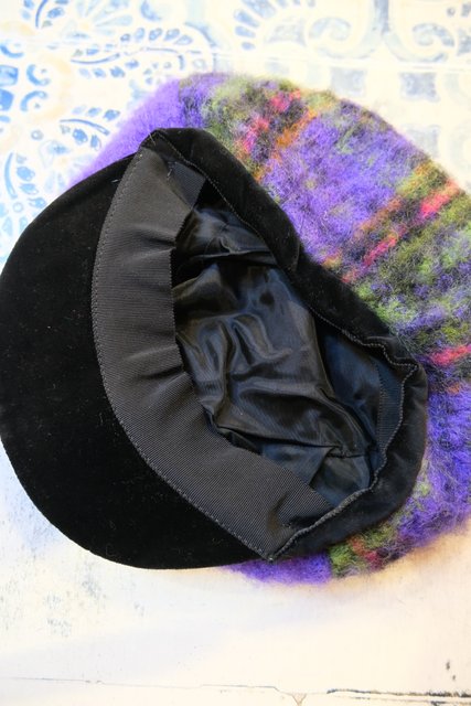 高級感漂う黒ベロア×パープルベースのチェック柄デザインが魅力的な1970~80年代頃のヨーロピアンヴィンテージ帽子