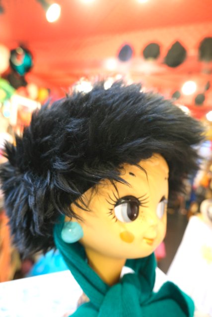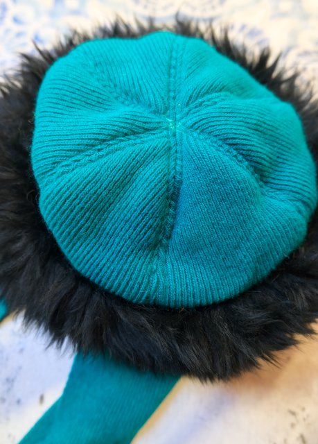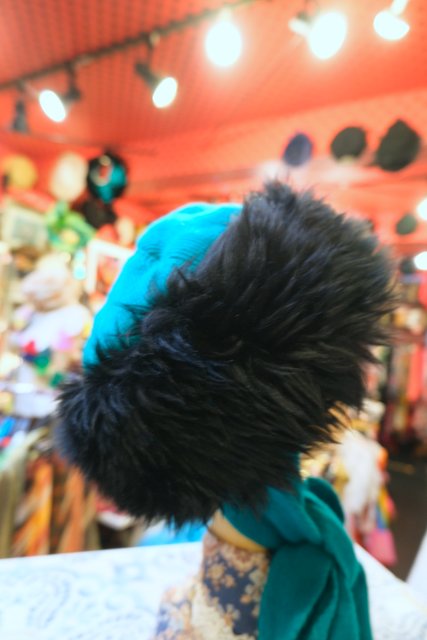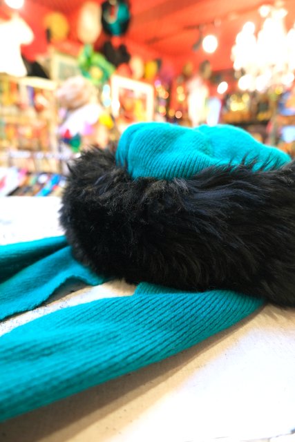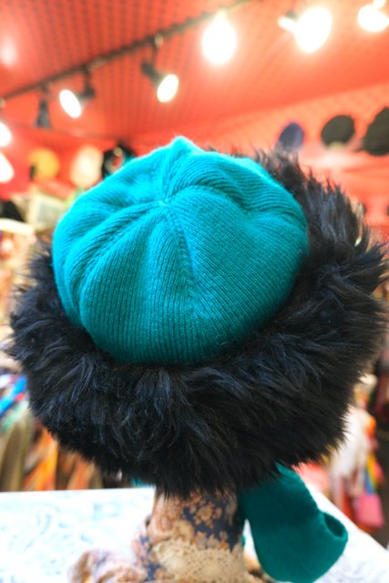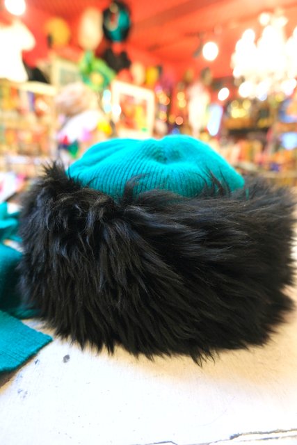 ボリューミーな黒フェイクファー×グリーンの顎紐ショールデザインがお洒落で個性的な1970~80年代頃のヨーロピアンヴィンテージ帽子