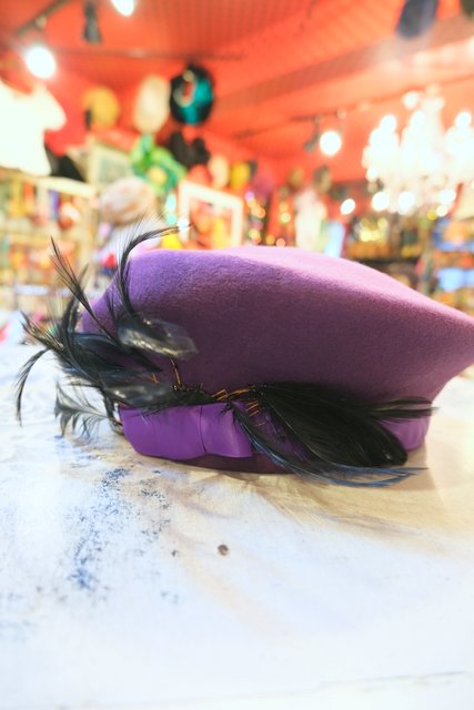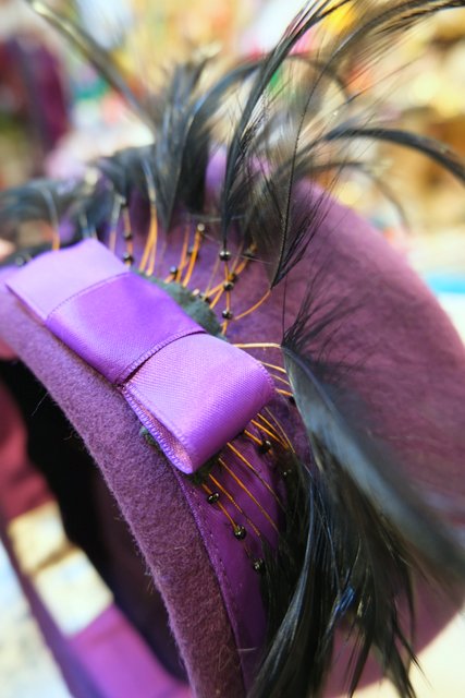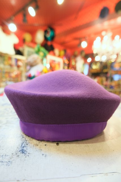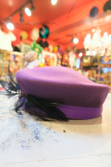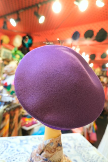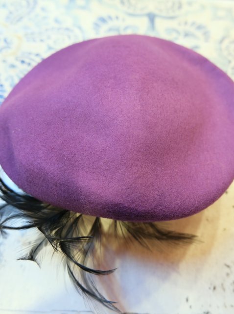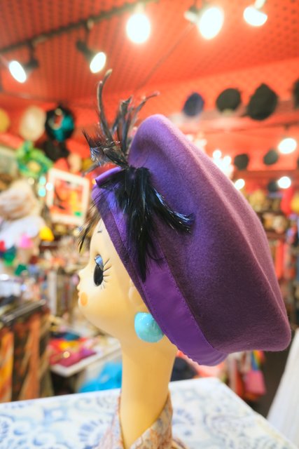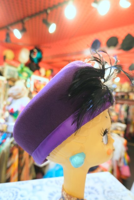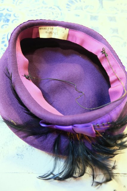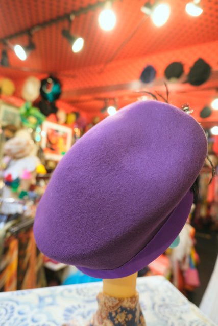 レトロクラシックなパープルベースにリボン×羽デザインがお洒落な1950~60年代頃のフランス製ヴィンテージ帽子