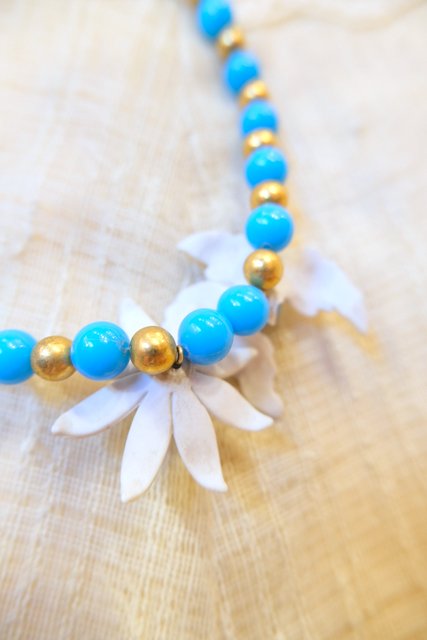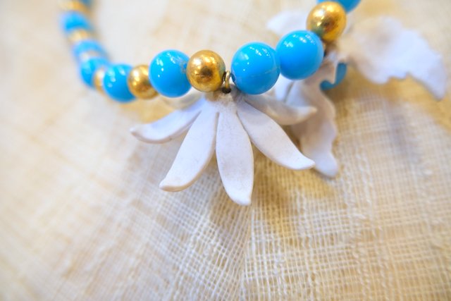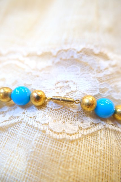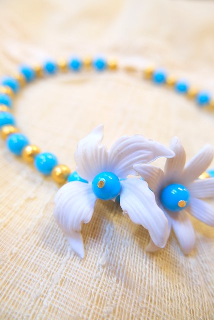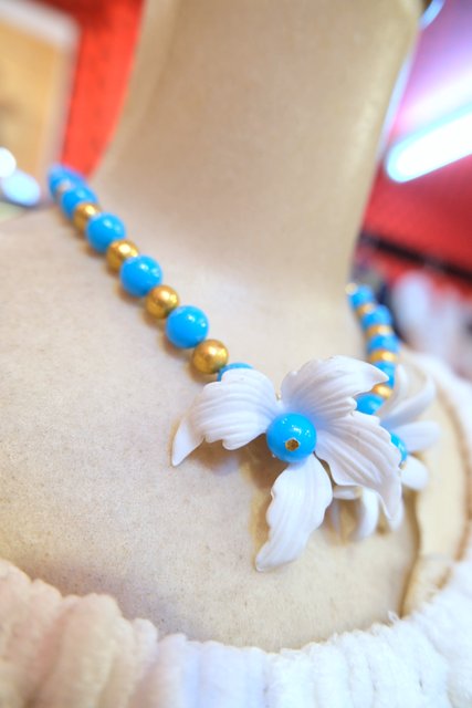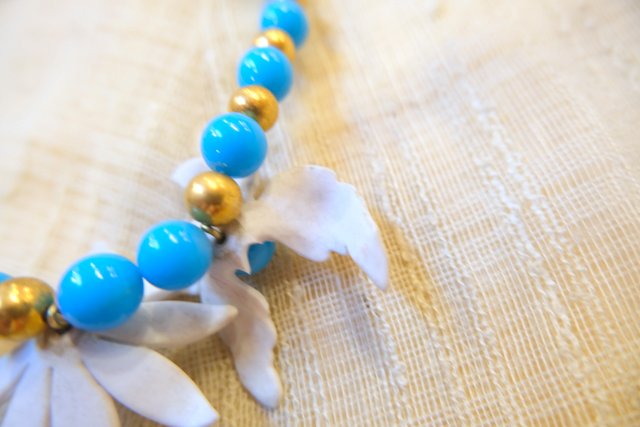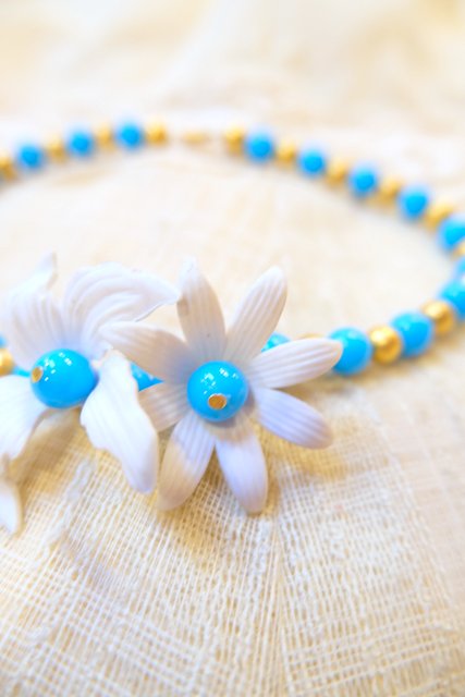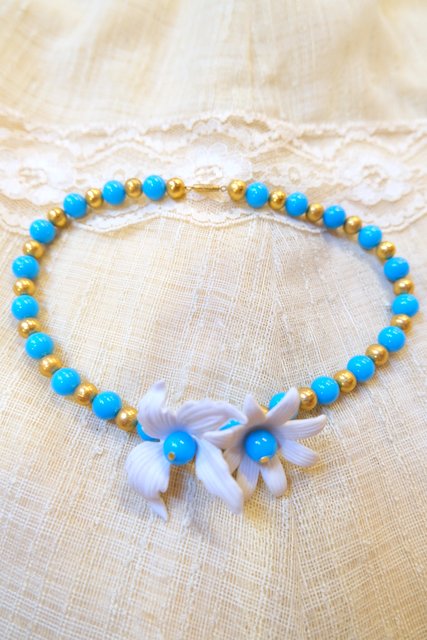 レトロポップな水色ビーズに2種類のお花デザインが可愛らしいスペインで見つけた1960~70年代頃のヨーロピアンヴィンテージネックレス