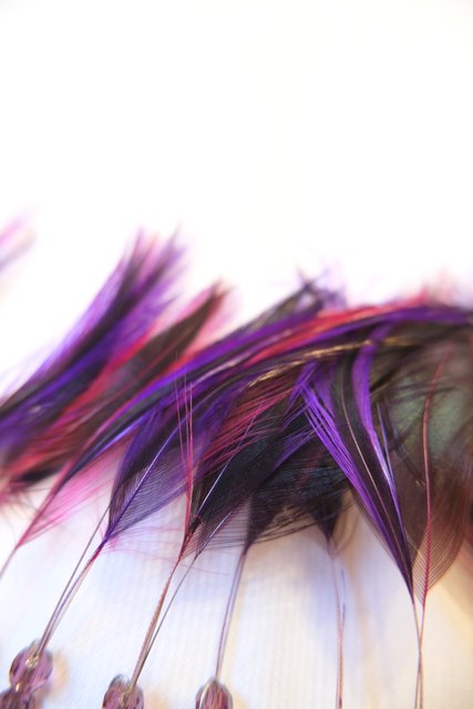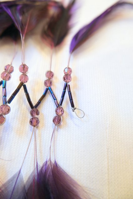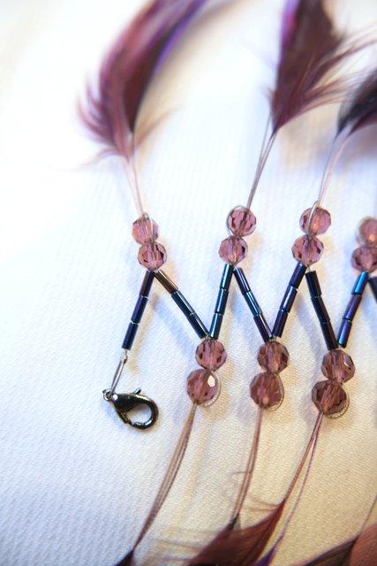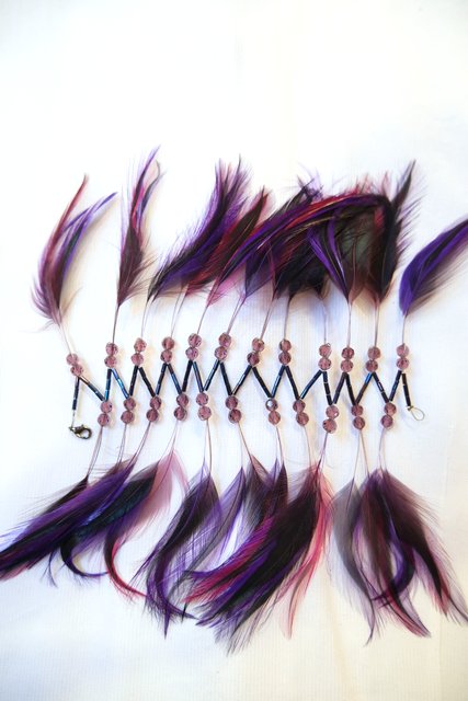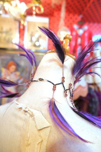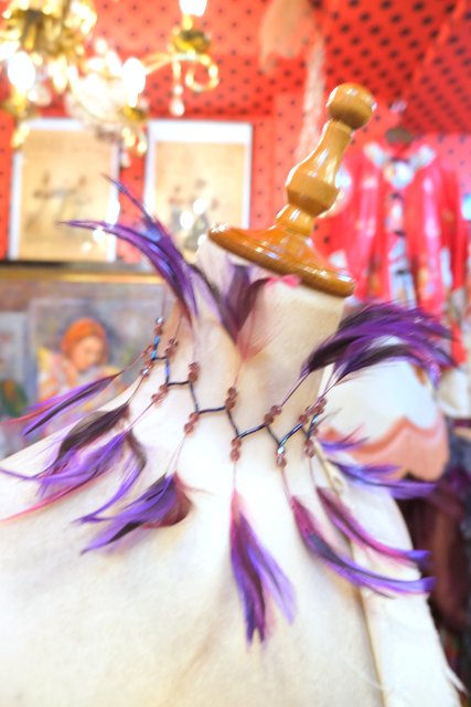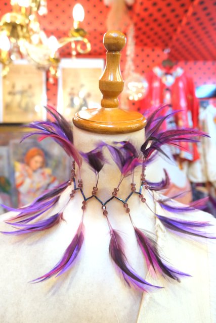 パープルベースのビーズ×フェザーの高さがあるデザインがお洒落で個性的なスペインで見つけたパーティーネックレス