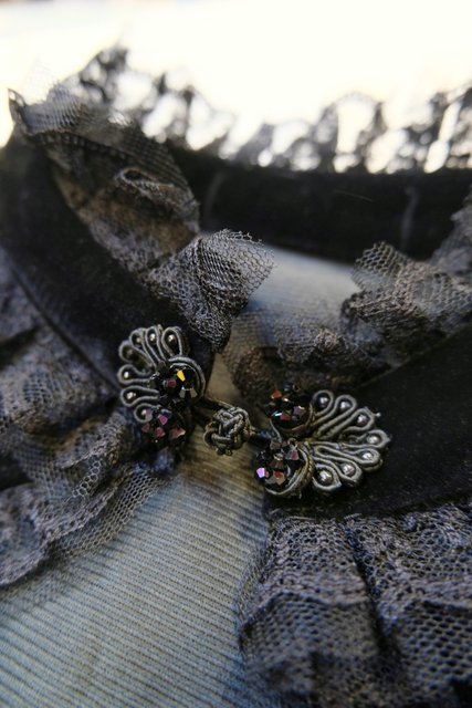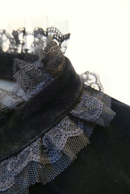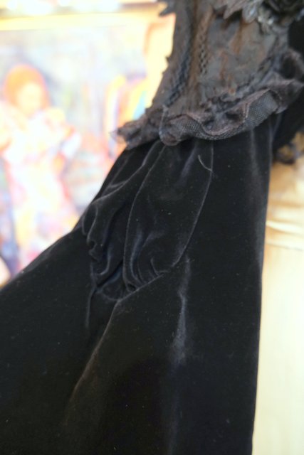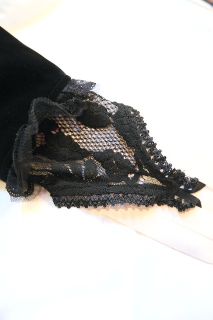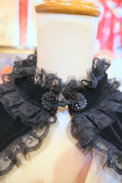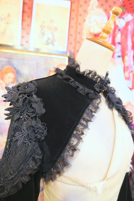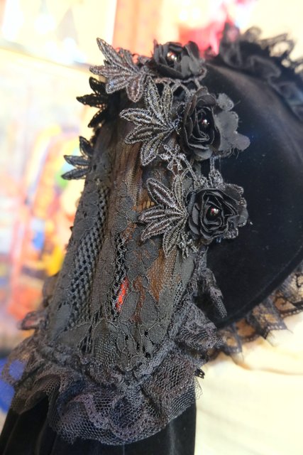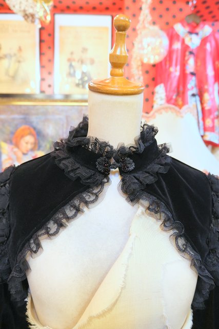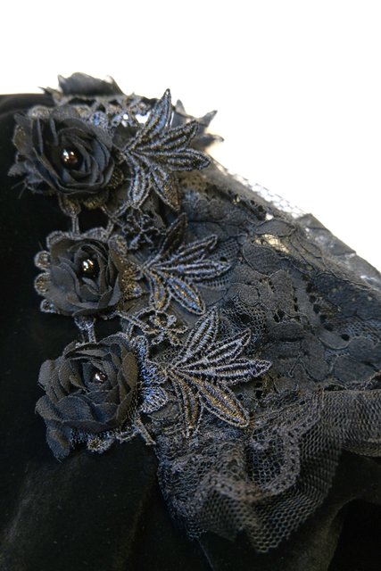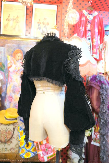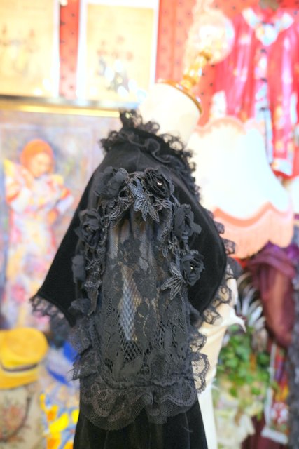 高級感漂う黒ベロアベースにフリルレース襟やお花コサージュ&レース袖、袖の膨らみを強調させてくれるフィンガーレスグローブ付きのロングカフスが魅力的なヨーロピアンパーティーボレロジャケット レトロクラシックスタイルにおススメ!