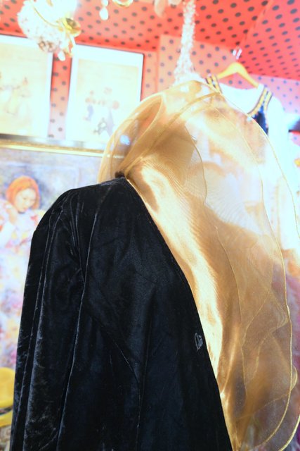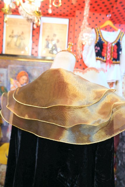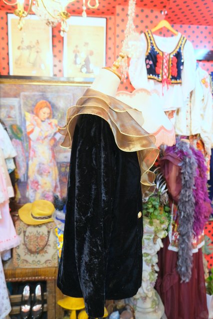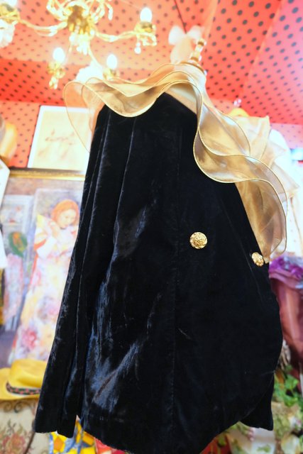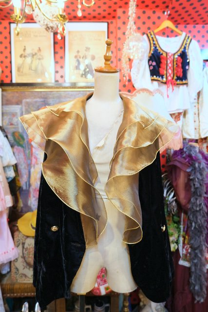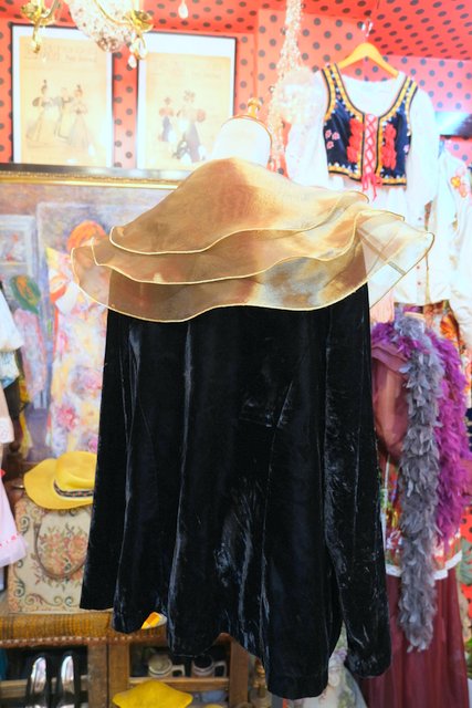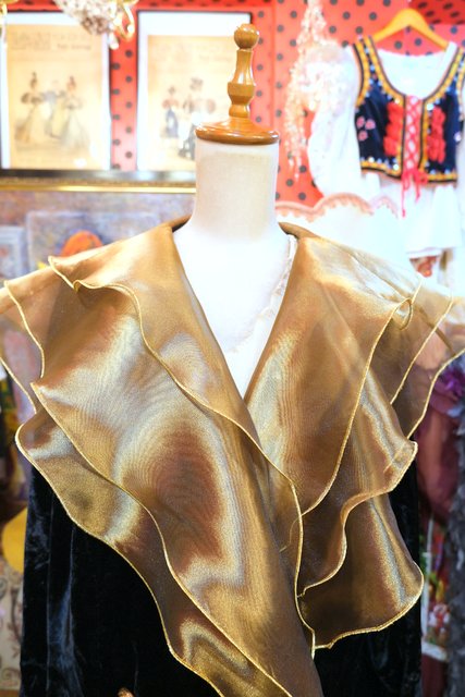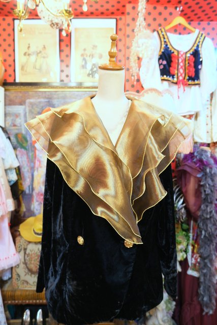 高級感漂う黒ベロアベースに3枚重ねのボリューミーなオーガンジーフリル襟が魅力的な1980年代頃のヨーロピアンヴィンテージジャケット