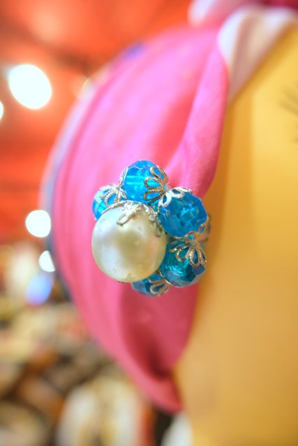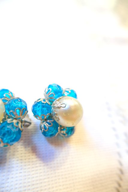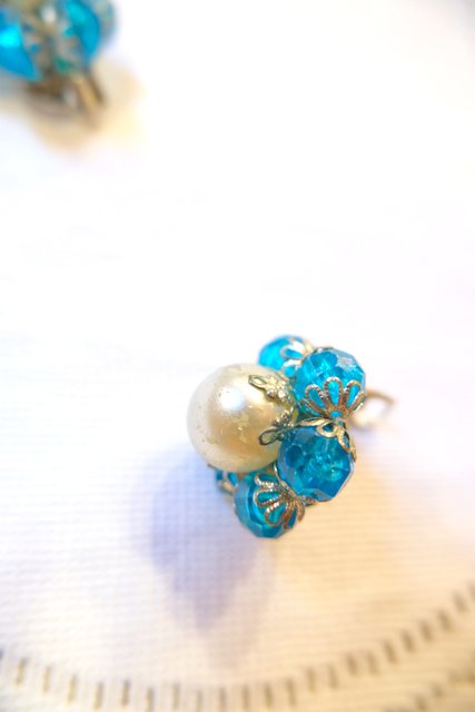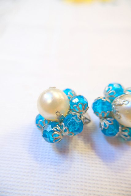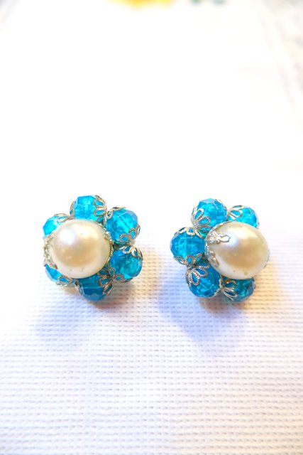 キラキラ輝く多角形の水色ビーズ×大きなパールデザインが素敵なフランスのアンティークショップで見つけた1970年代頃のヨーロピアンヴィンテージイヤリング