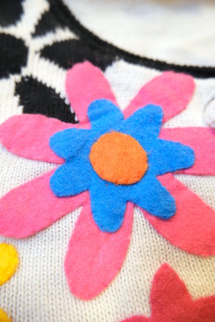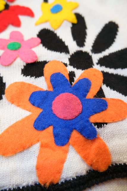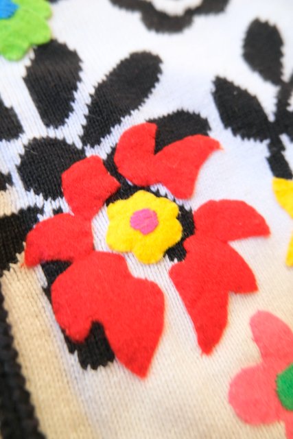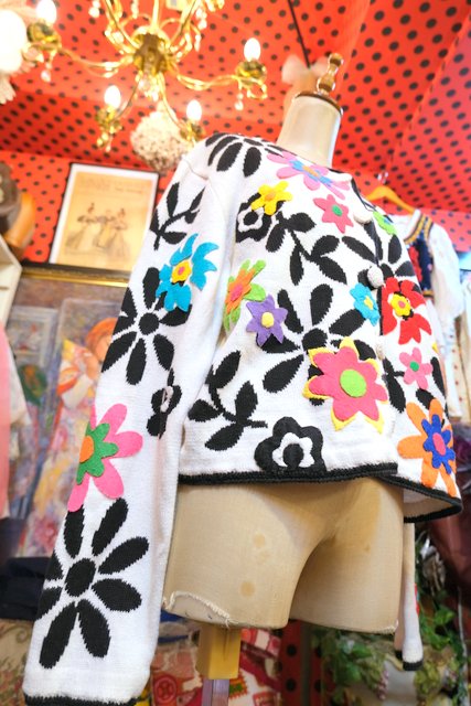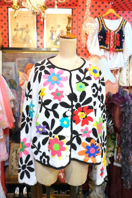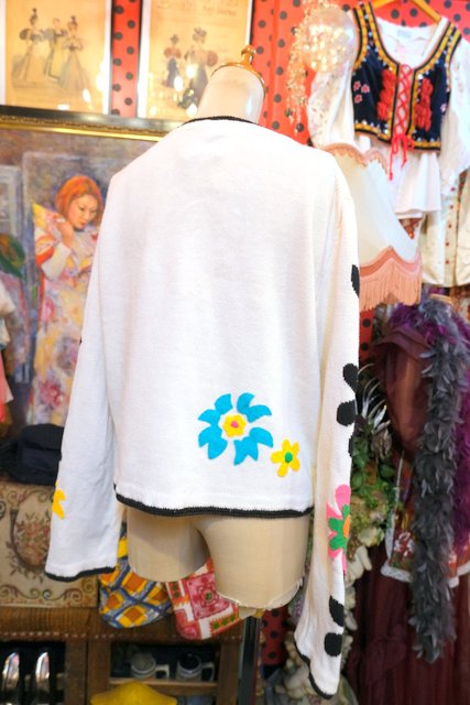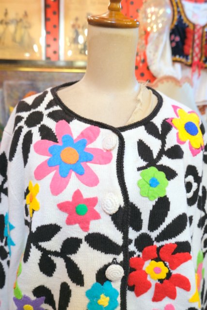 白×黒の花柄ベースにカラフルポップなお花アップリケが可愛らしい1980年代頃のヨーロピアンヴィンテージオーバーサイズカーディガン ★SALE★
