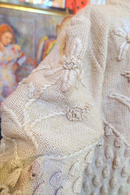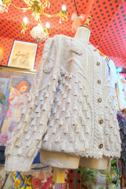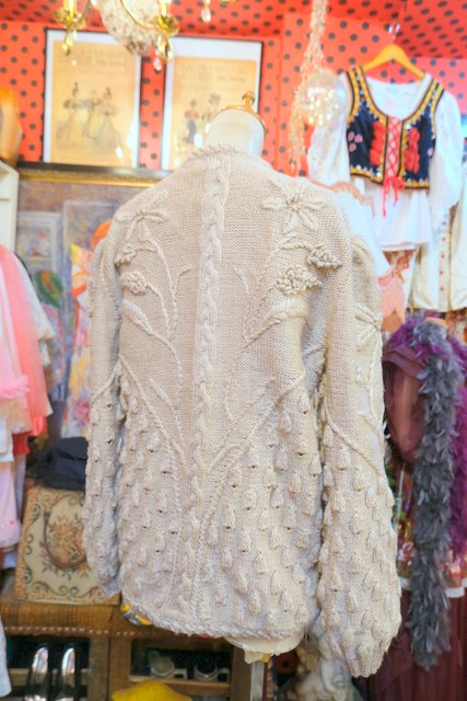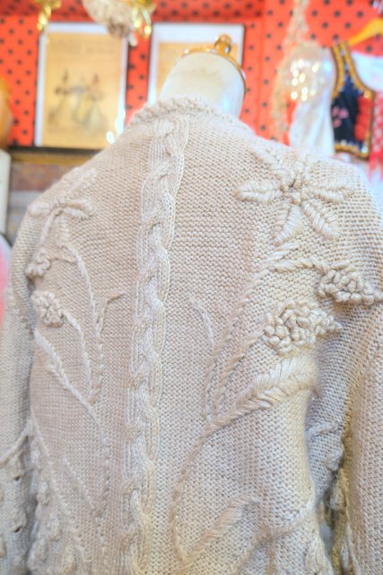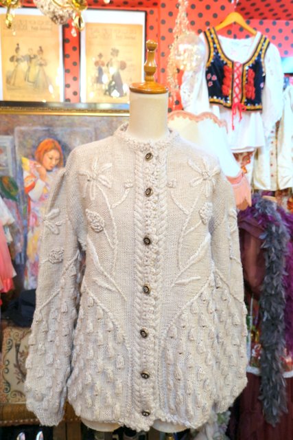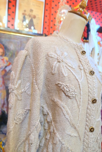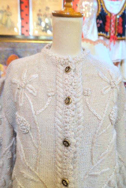 ベージュベースに立体感があるお花刺繍や粒々の木の実デザインが存在感たっぷりの1970~80年代ヨーロピアンヴィンテージチロルカーディガン ゆったりとしたオーバーサイズがルーズでガーリーな印象になる一枚! ★SALE★