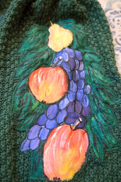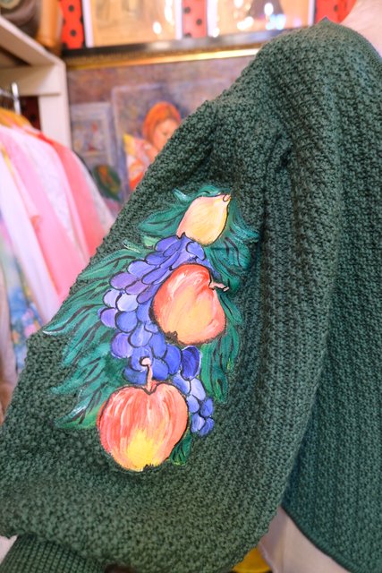 ボリューミーなパフスリーブに袖の膨らみが強調されるロングカフスやカラフルポップなフルーツ柄ペイントアップリケが魅力的な1970~80年代頃のヨーロピアンヴィンテージチロルカーディガン カモ柄のレトロボタンがお洒落ポイント!