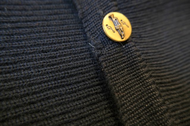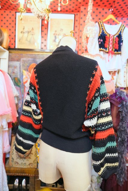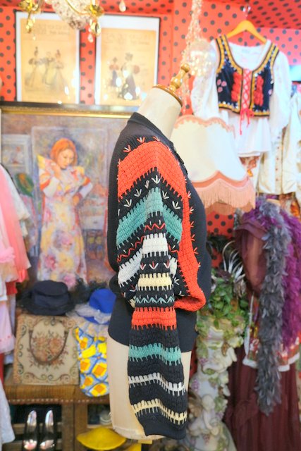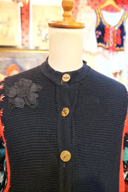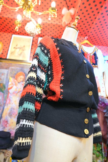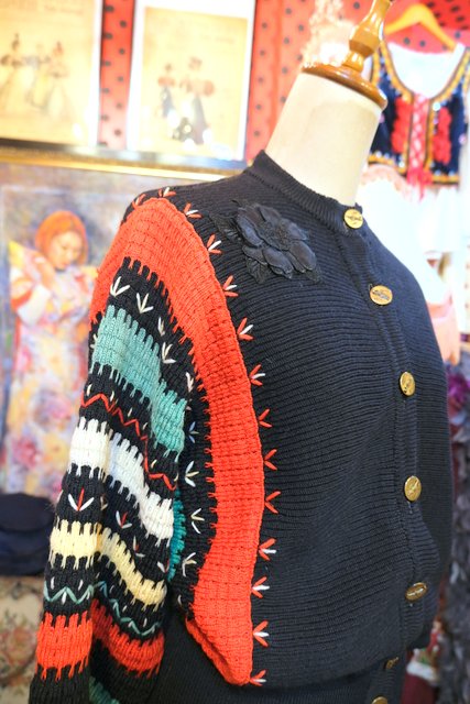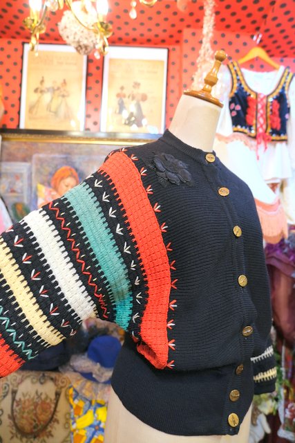 カラフルなボーダードルマンスリーブデザインにお花ワッペンやトランペット×音符柄ボタンが可愛らしい1960年代頃のヨーロピアンヴィンテージカーディガン ★SALE★