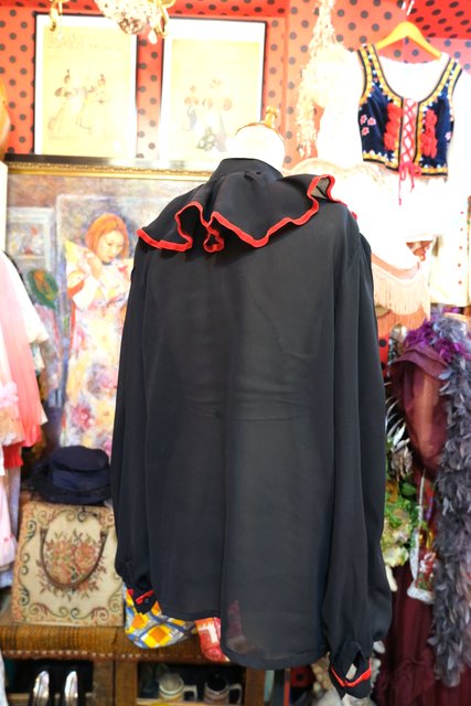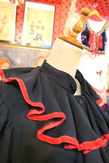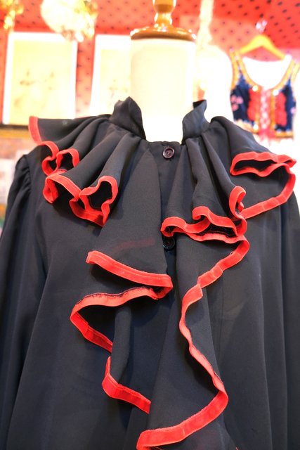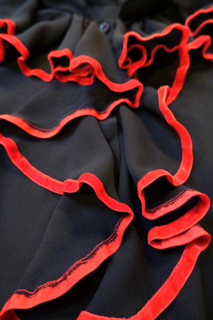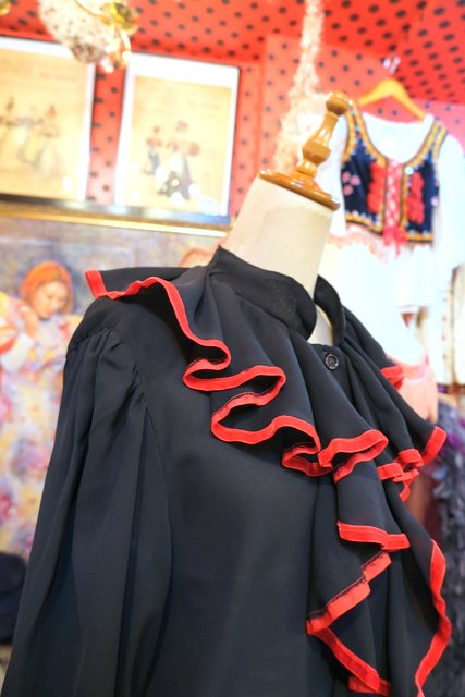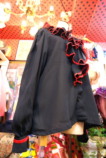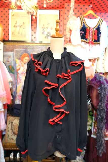 透け感がある黒ベースにボリューミーなフリル×赤パイピングデザインが魅力的なヨーロピアンヴィンテージブラウス