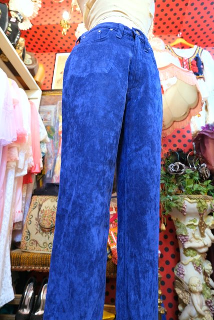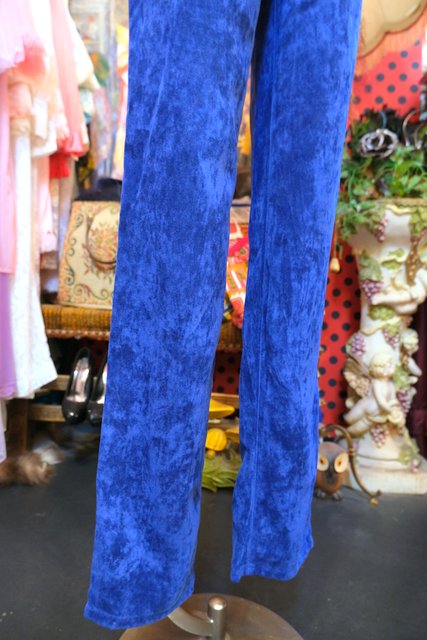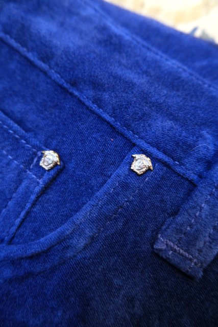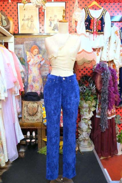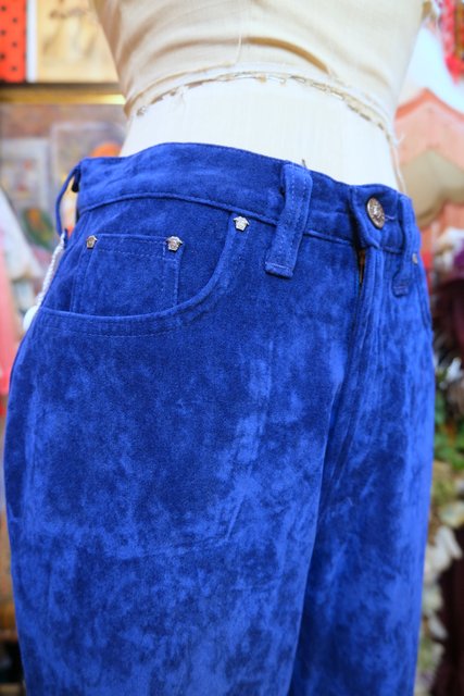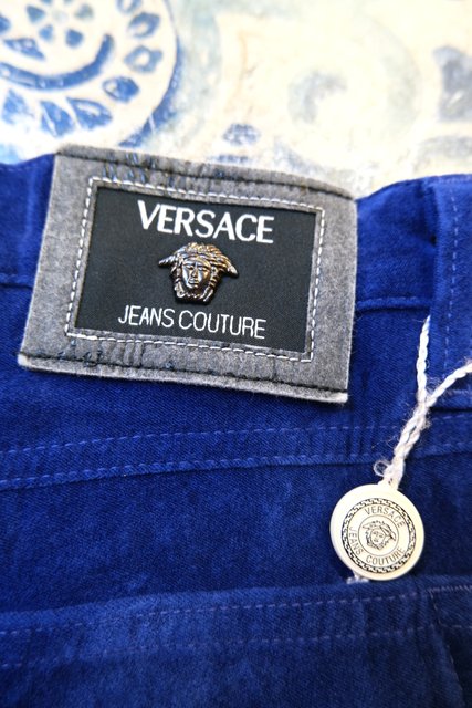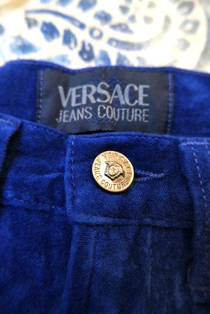 上品でクールな印象のブルーベロアに小さなVERSACEマークが可愛らしいイタリア製VERSACE JEANS COUTUREパンツ