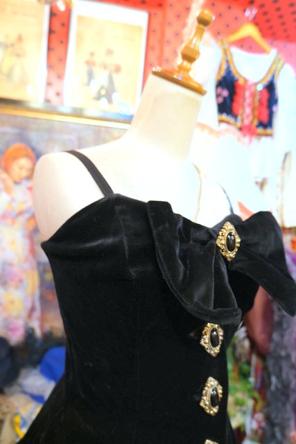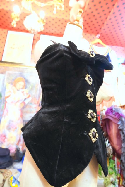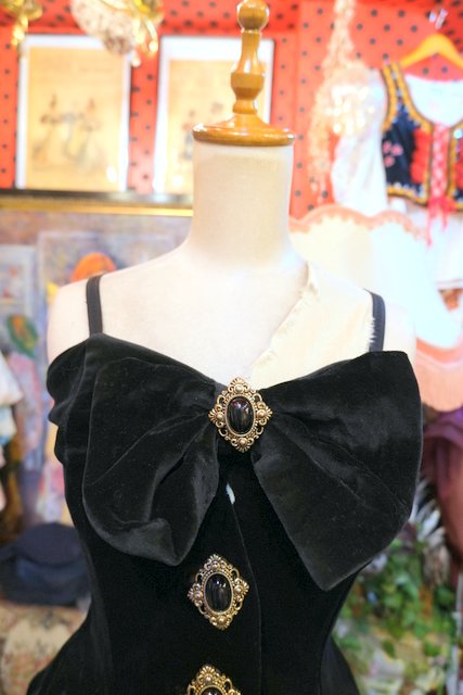 宝石のようなエレガントゴージャスボタン×大きなリボンが魅力的な1980年代頃のイングランド製ヴィンテージベロアコルセット