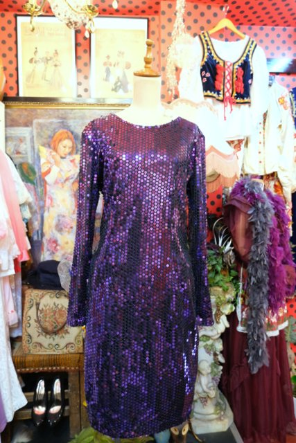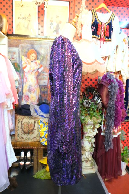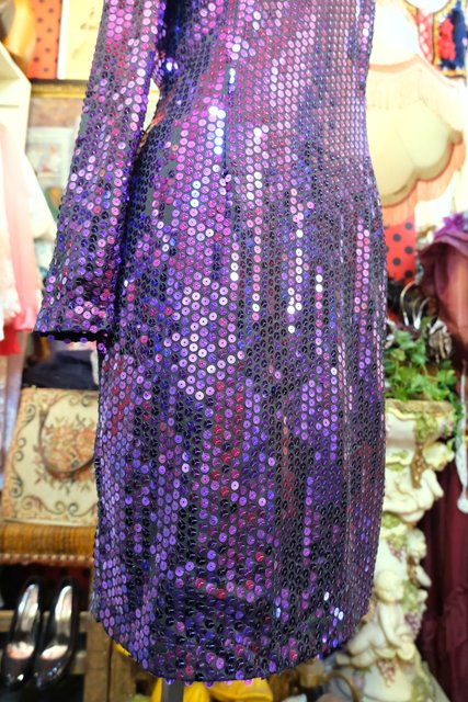 キラキラ輝くパープルスパンコールにタイトなシルエットがカッコいい1980年代頃のヨーロピアンヴィンテージパーティードレス