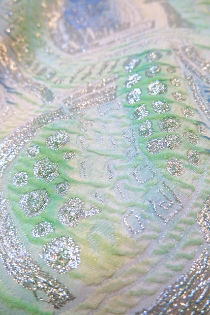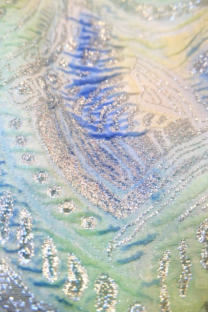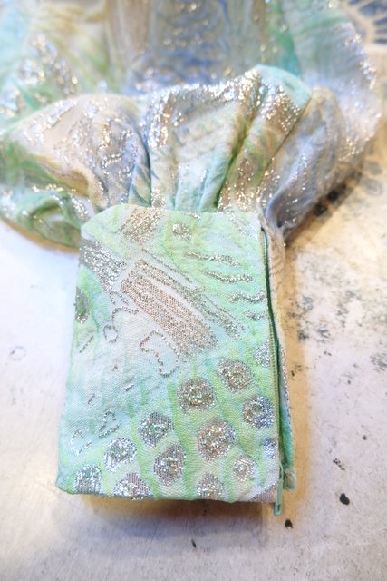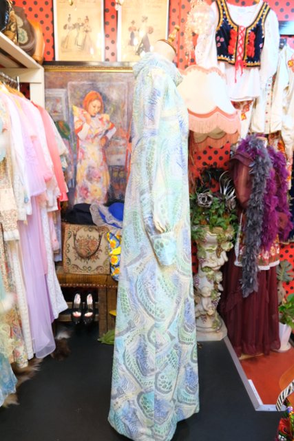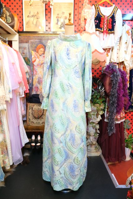 パステルカラー×メタリックのサイケデリック模様に袖の膨らみが強調されるロングカフスが魅力的な1970年代頃のヨーロピアンヴィンテージロングドレス