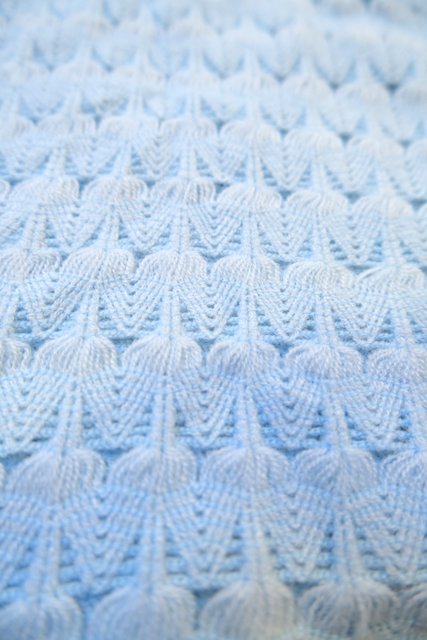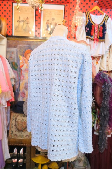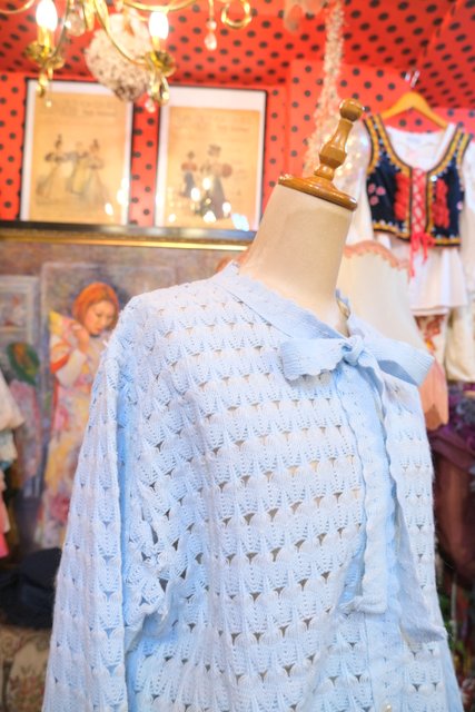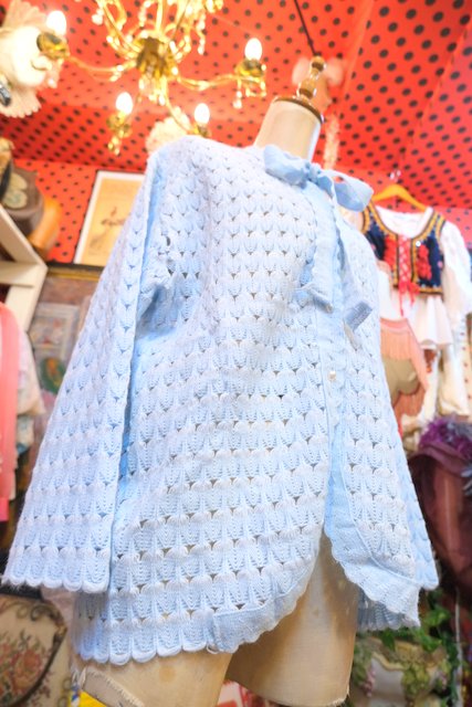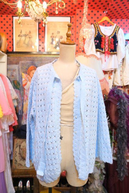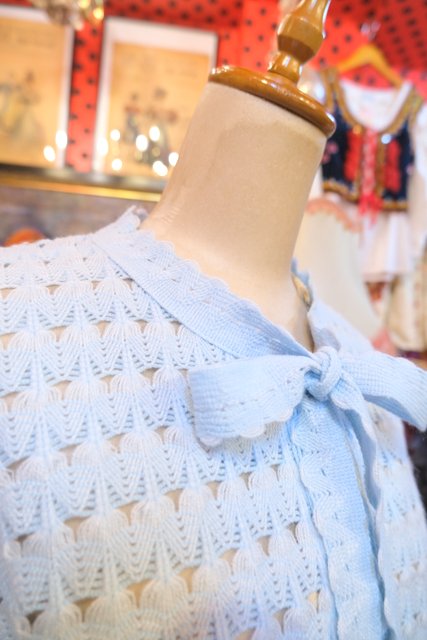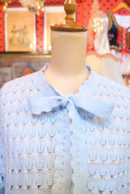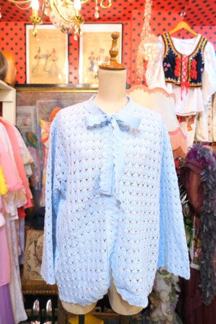 ハートのような模様にメルヘンな水色カラーやリボンデザインが可愛らしい1970年代頃のヨーロピアンヴィンテージニットカーディガン