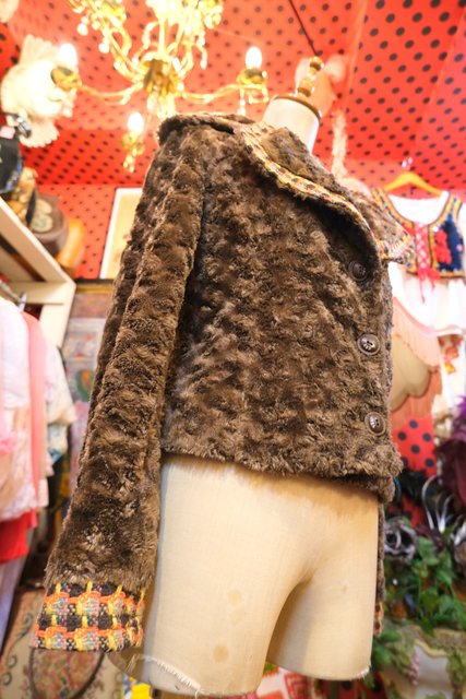 艶感があるこげ茶色のフェイクファー×カラフルなツイード生地切り替えデザインがお洒落なヨーロピアンファージャケット ★SALE★