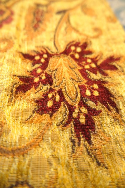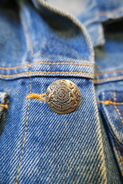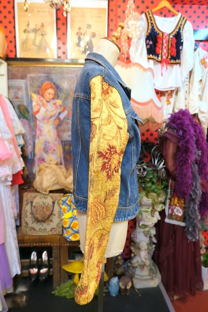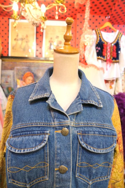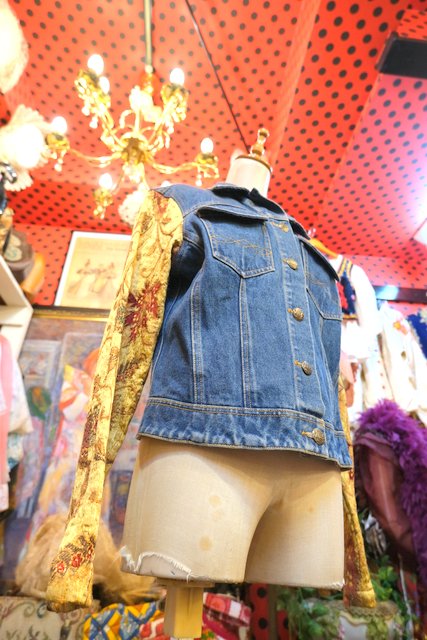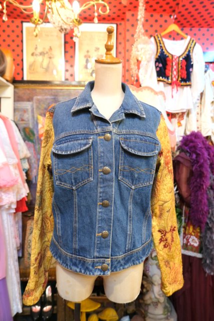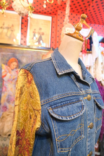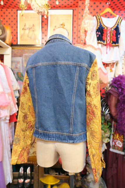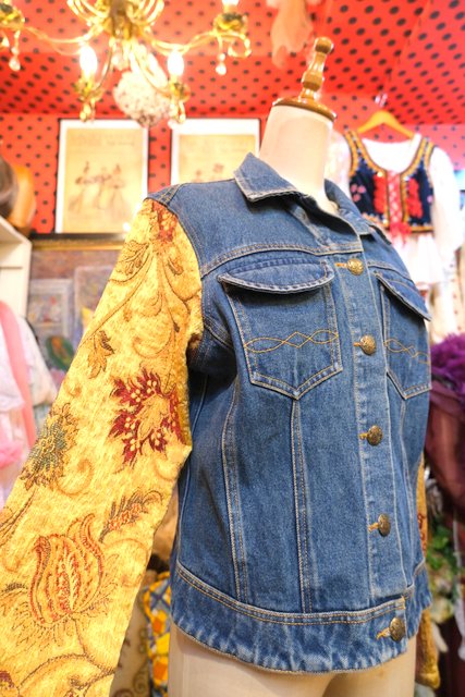 デニム×エレガントなゴブラン切り替えデザインに紋章ボタンがカッコいい1990年代頃のUSA製ヴィンテージデニムジャケット