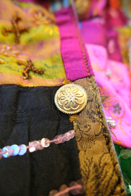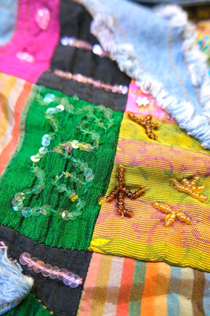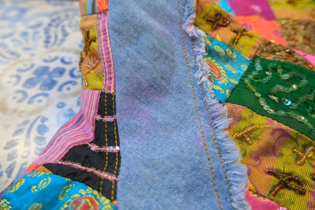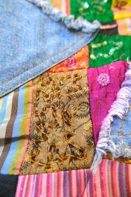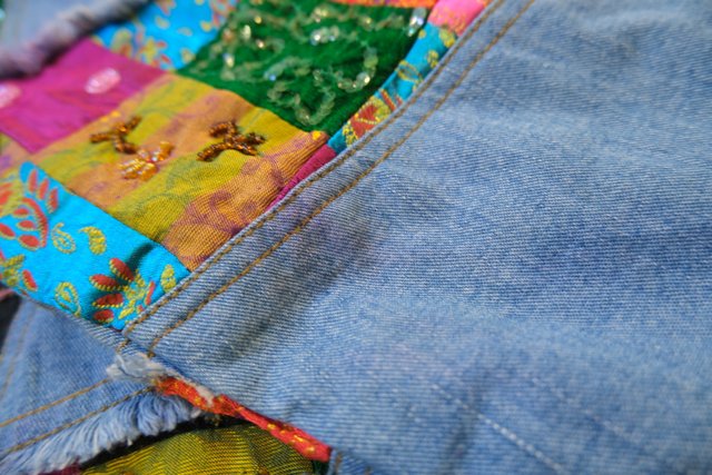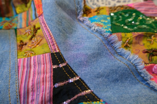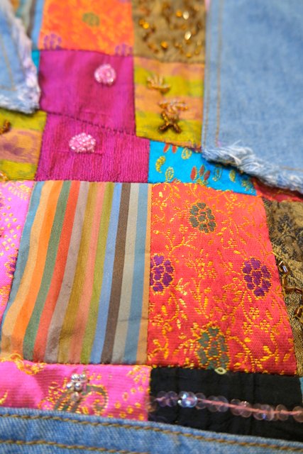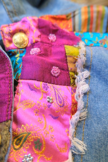 ビーズやスパンコール装飾付きのカラフルなエスニックパッチワークが魅力的な1990年代頃のヨーロピアンヴィンテージデニムジャケット