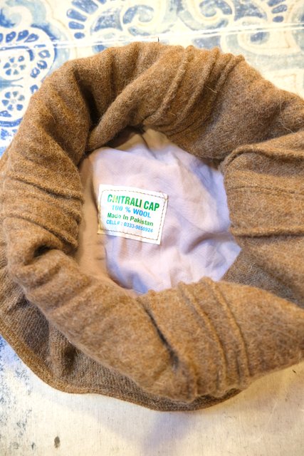 パキスタンやアフガニスタンで着用される平らで丸い上部とその周囲を巻き上げた下部のつばが特徴のパキスタン製チトラリ帽子