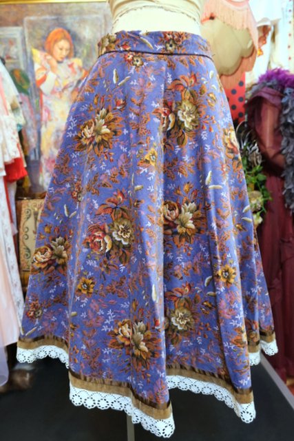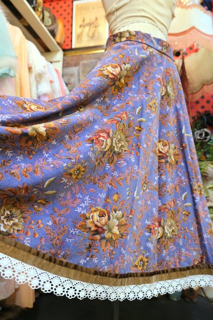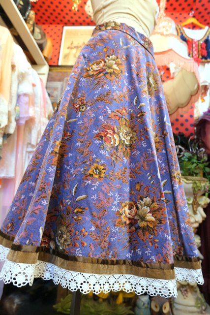 エレガントな花柄模様に茶系テープや花柄レースデザインが魅力的な1980年代頃のヨーロピアンヴィンテージベロアスカート