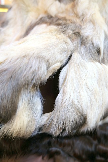 白、グレイMIXのゆるやかなウェーブ状で光沢があるチキャンラム毛皮が魅力的な1960~70年代頃のヨーロピアンヴィンテージファーマントケープ